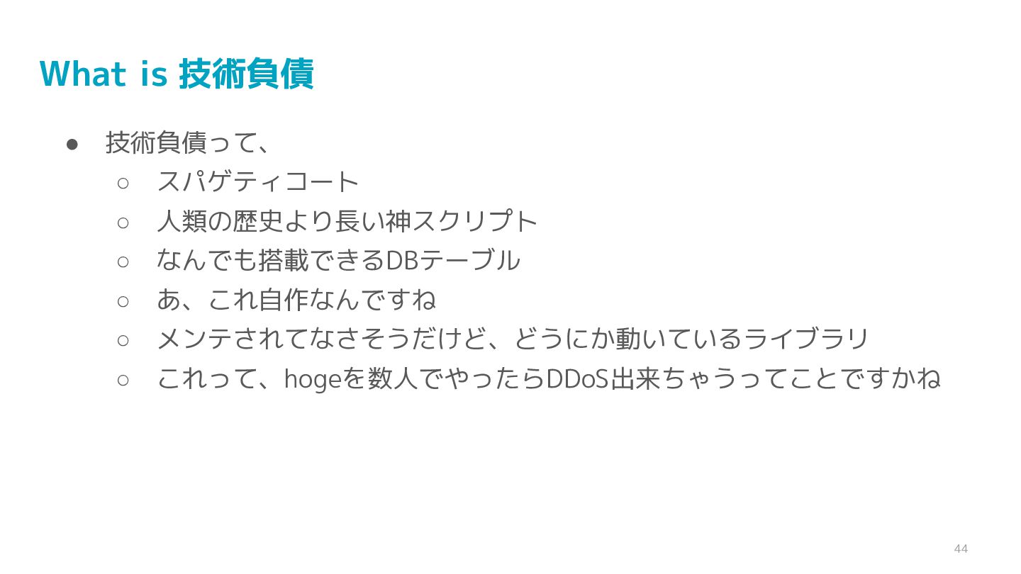 44 • 技術負債って、 ◦ スパゲティコート ◦ 人類の歴史より長い神スクリプト ◦ なんでも搭載できるDBテーブル ◦