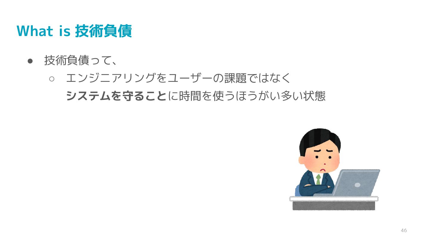 46 • 技術負債って、 ◦ エンジニアリングをユーザーの課題ではなく システムを守ることに時間を使うほうがい多い状態 What is 技術負債