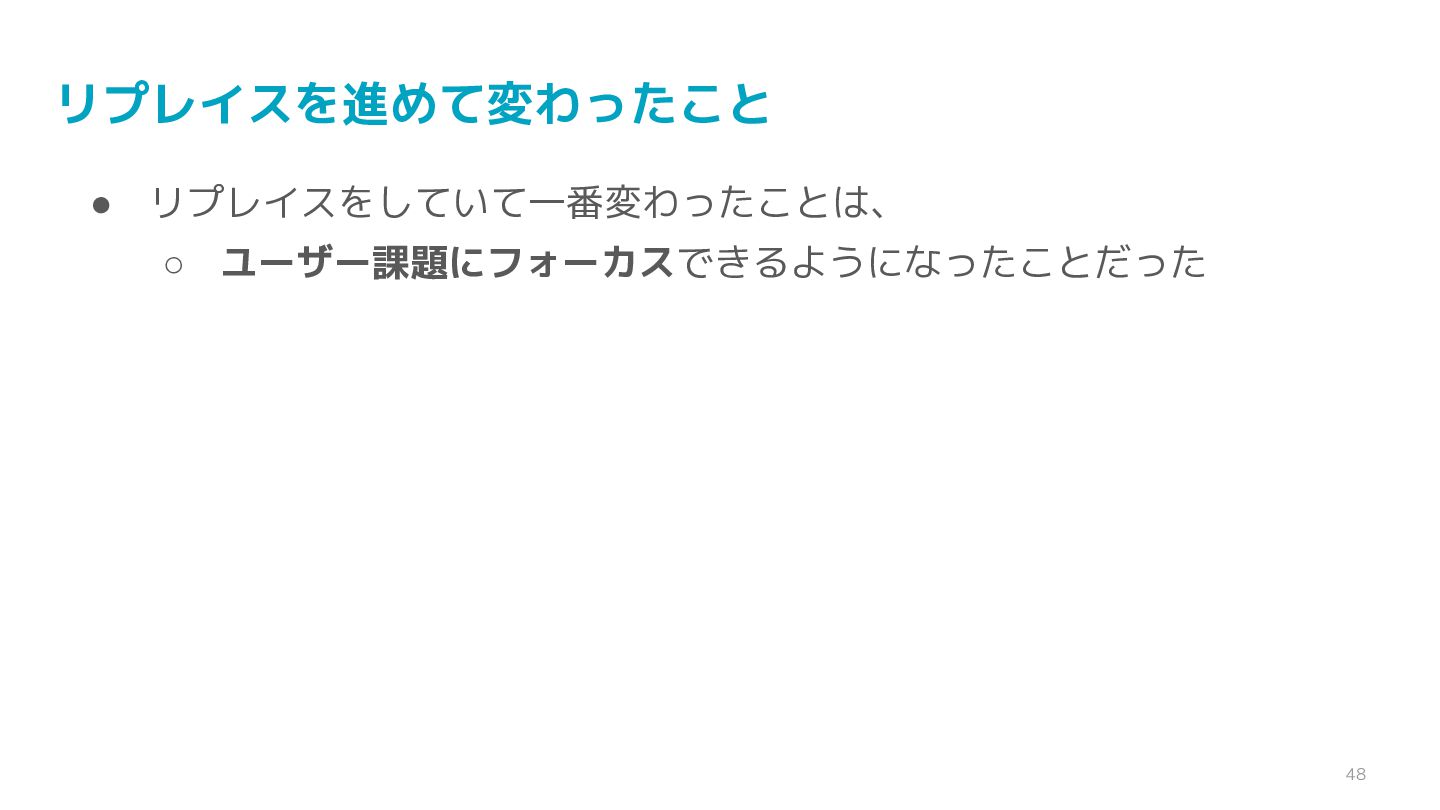 48 • リプレイスをしていて一番変わったことは、 ◦ ユーザー課題にフォーカスできるようになったことだった リプレイスを進めて変わったこと