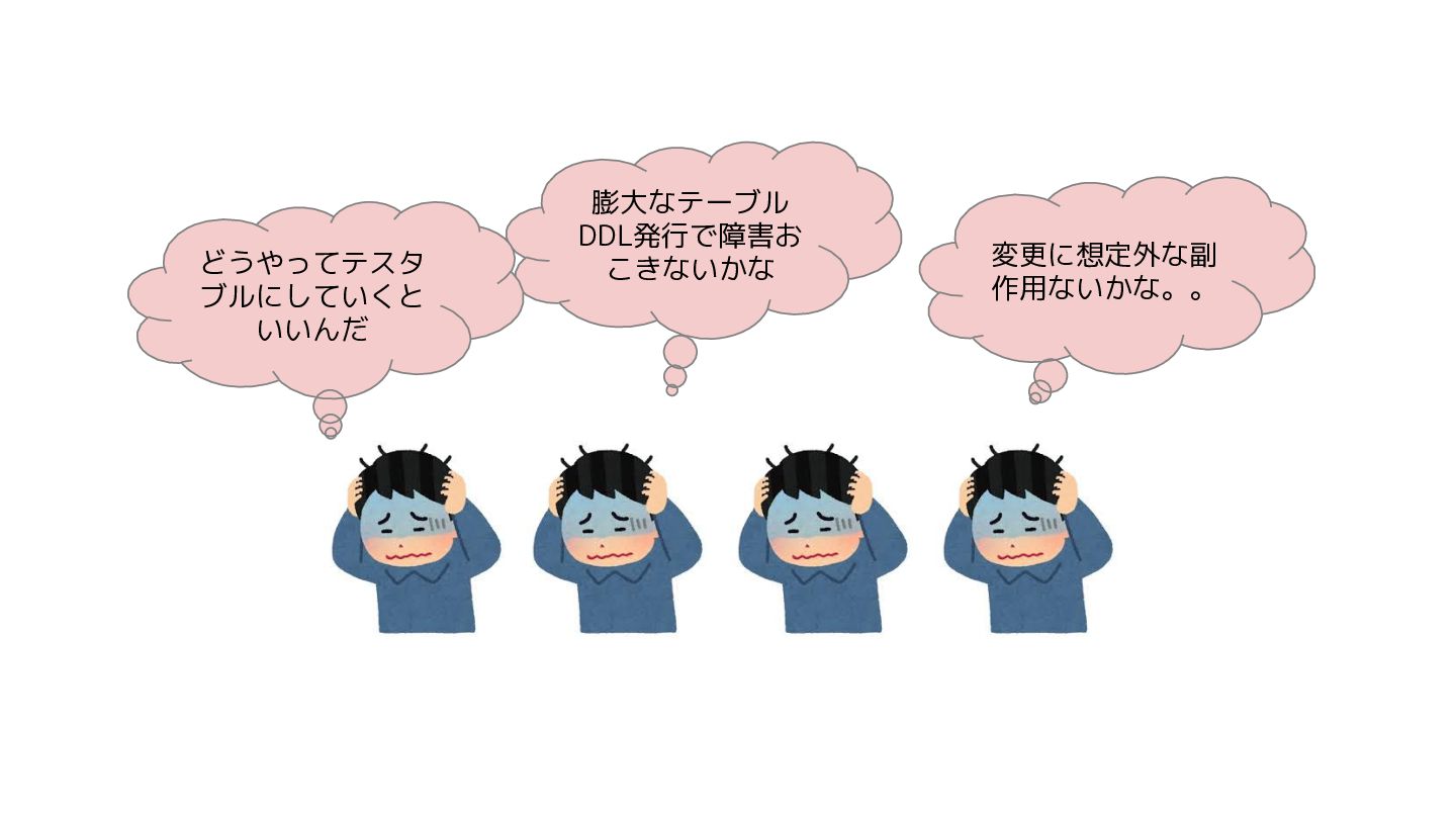 変更に想定外な副 作用ないかな。。 膨大なテーブル DDL発行で障害お こきないかな どうやってテスタ ブルにしていくと いいんだ
