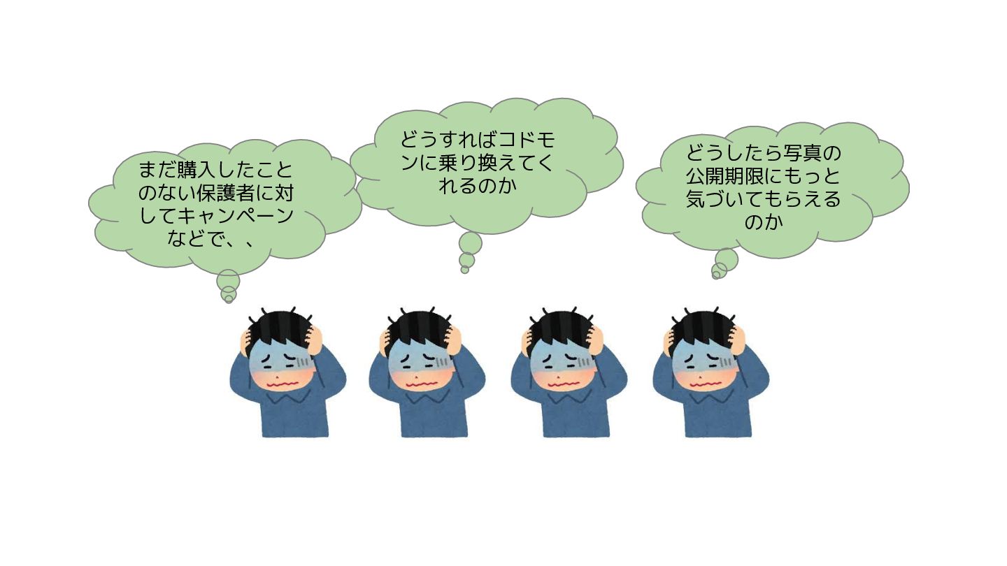 どうしたら写真の 公開期限にもっと 気づいてもらえる のか どうすればコドモ ンに乗り換えてく れるのか まだ購入したこと のない保護者に対 してキャンペーン