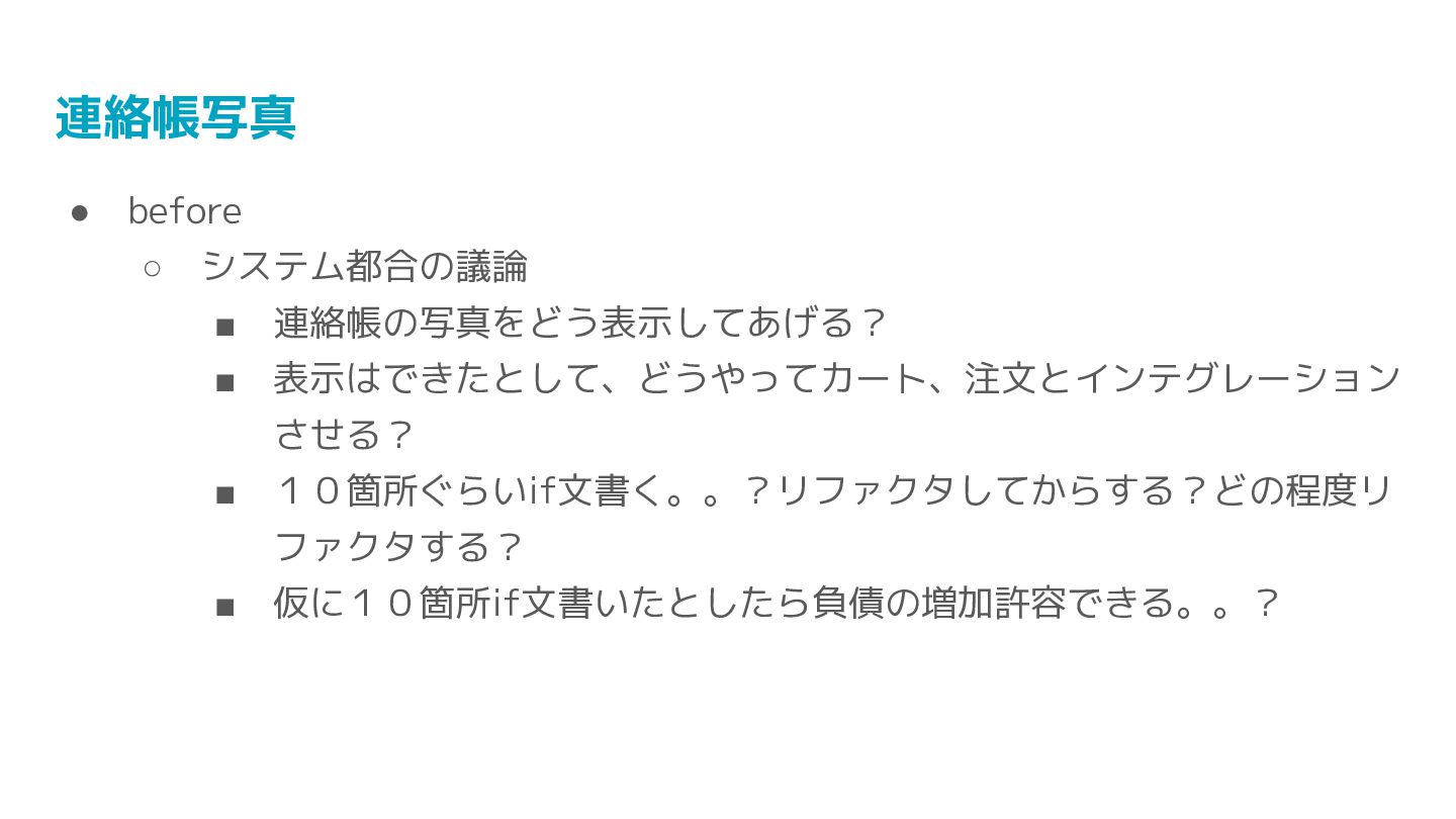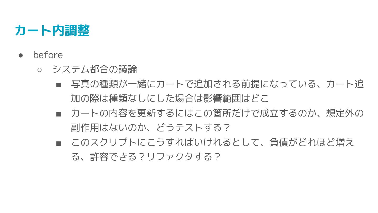 • before ◦ システム都合の議論 ▪ 写真の種類が一緒にカートで追加される前提になっている、カート追 加の際は種類なしにした場合は影響範囲はどこ ▪ カートの内容を更新するにはこの箇所だけで成立するのか、想定外の 副作用はないのか、どうテストする?