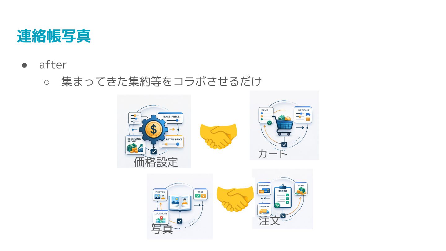 連絡帳写真 • after ◦ 集まってきた集約等をコラボさせるだけ 価格設定 カート 写真 注文