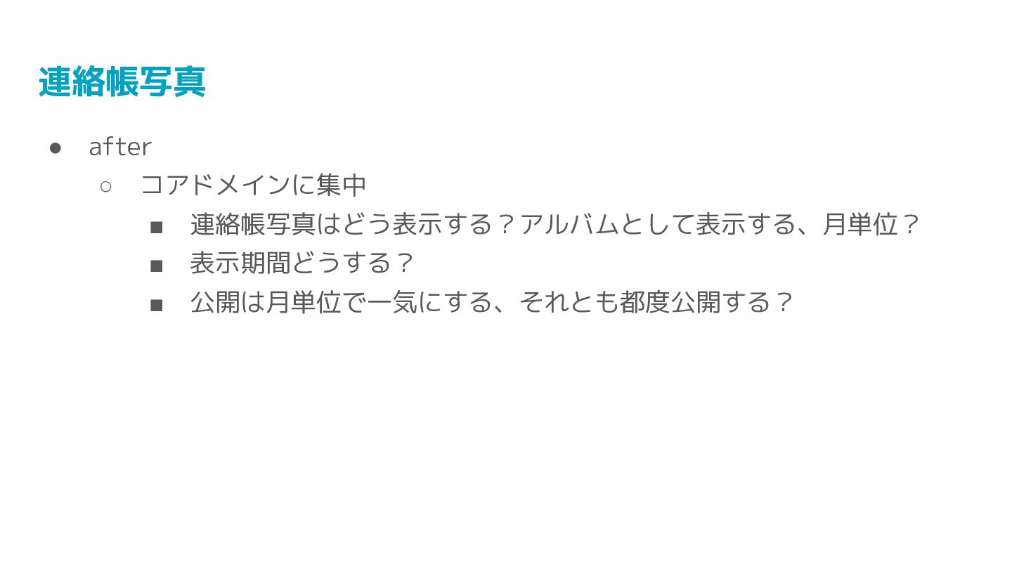 連絡帳写真 • after ◦ コアドメインに集中 ▪ 連絡帳写真はどう表示する?アルバムとして表示する、月単位? ▪ 表示期間どうする? ▪