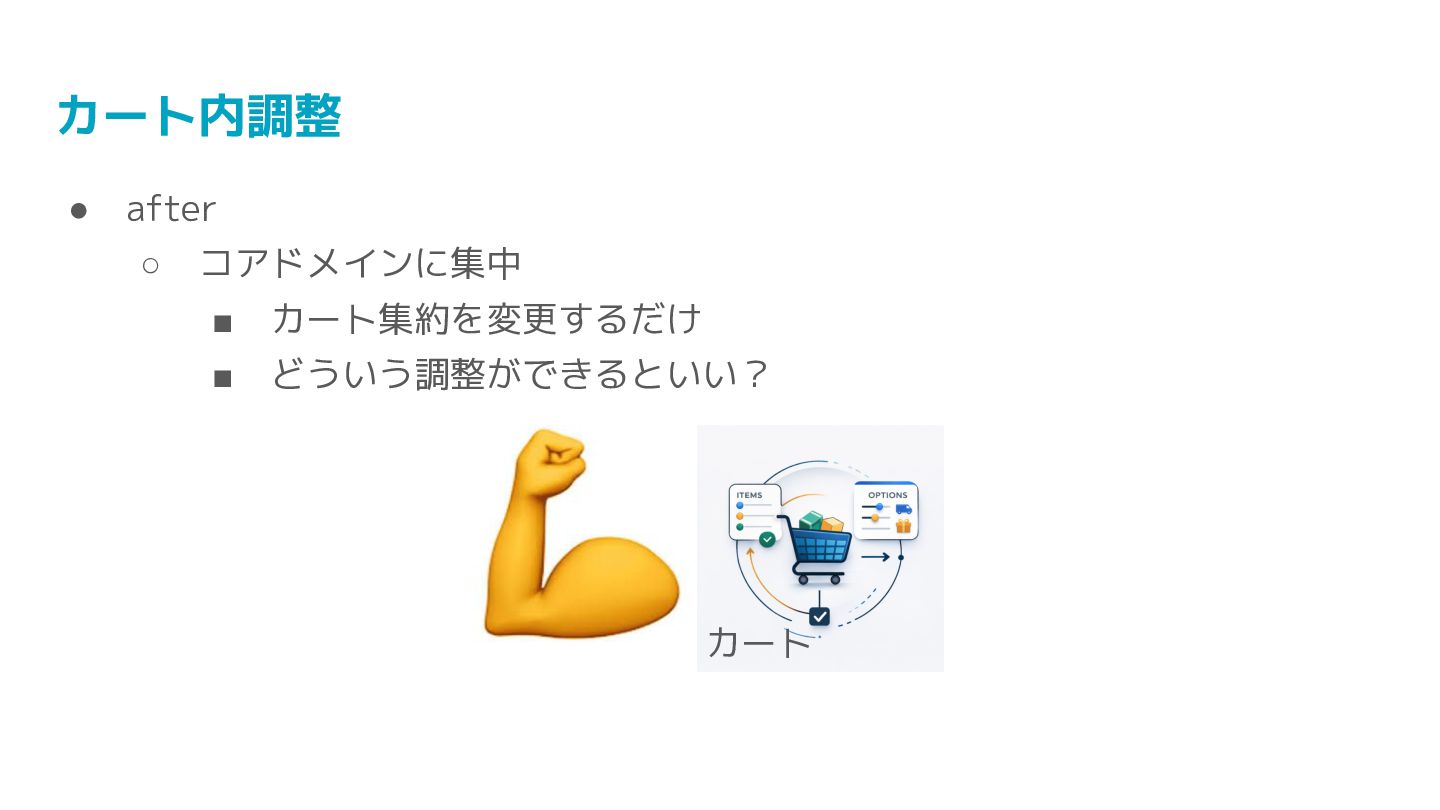 • after ◦ コアドメインに集中 ▪ カート集約を変更するだけ ▪ どういう調整ができるといい? カート内調整 カート