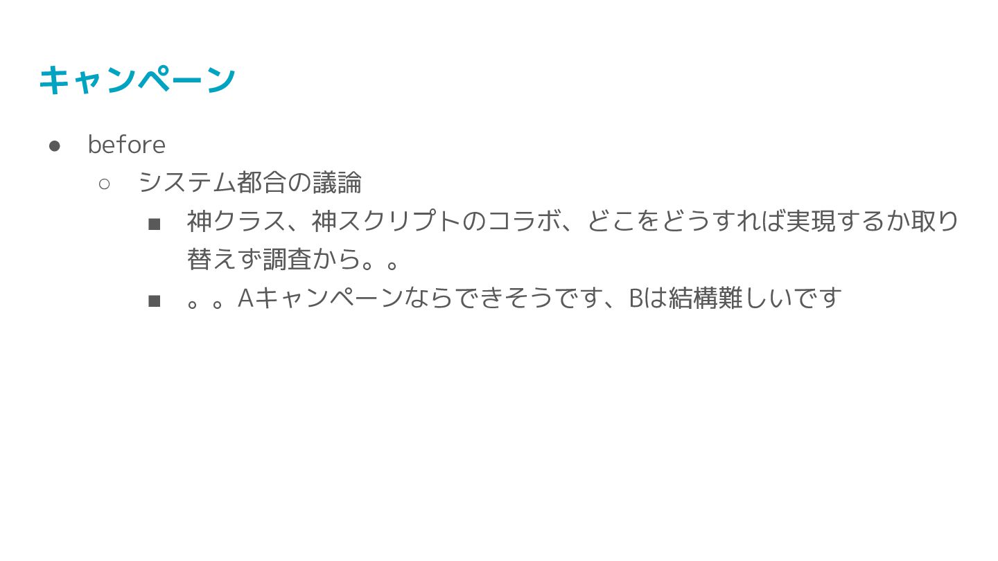 • before ◦ システム都合の議論 ▪ 神クラス、神スクリプトのコラボ、どこをどうすれば実現するか取り 替えず調査から。。 ▪ 。。Aキャンペーンならできそうです、Bは結構難しいです キャンペーン