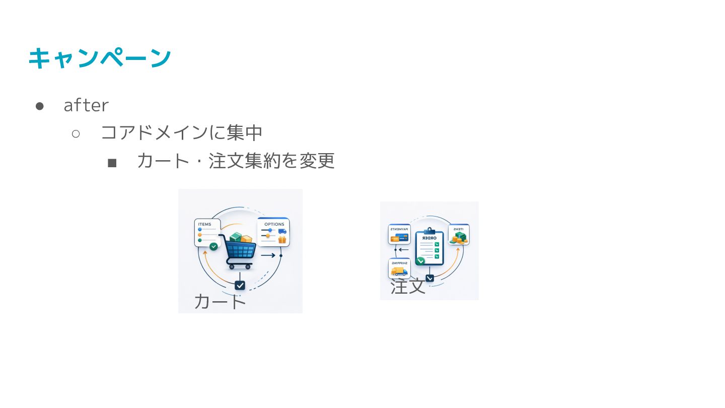 • after ◦ コアドメインに集中 ▪ カート・注文集約を変更 キャンペーン カート 注文