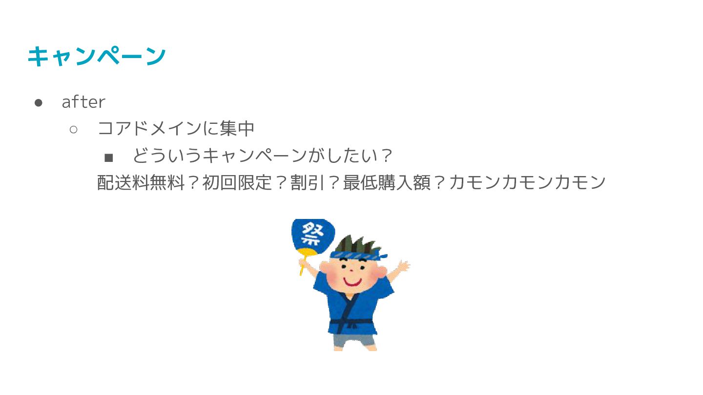 • after ◦ コアドメインに集中 ▪ どういうキャンペーンがしたい? 配送料無料?初回限定?割引?最低購入額?カモンカモンカモン キャンペーン