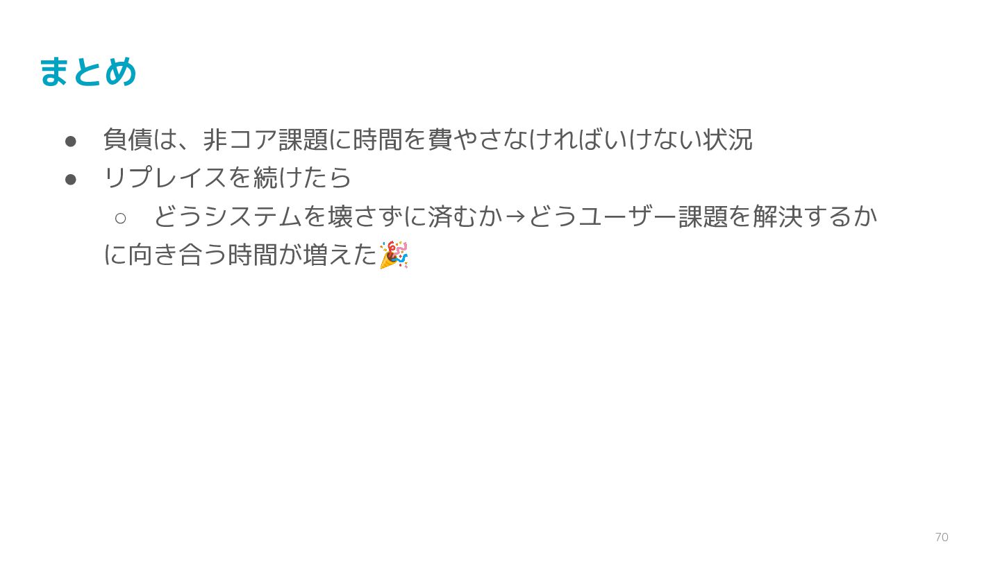 70 • 負債は、非コア課題に時間を費やさなければいけない状況 • リプレイスを続けたら ◦ どうシステムを壊さずに済むか→どうユーザー課題を解決するか に向き合う時間が増えた🎉 まとめ