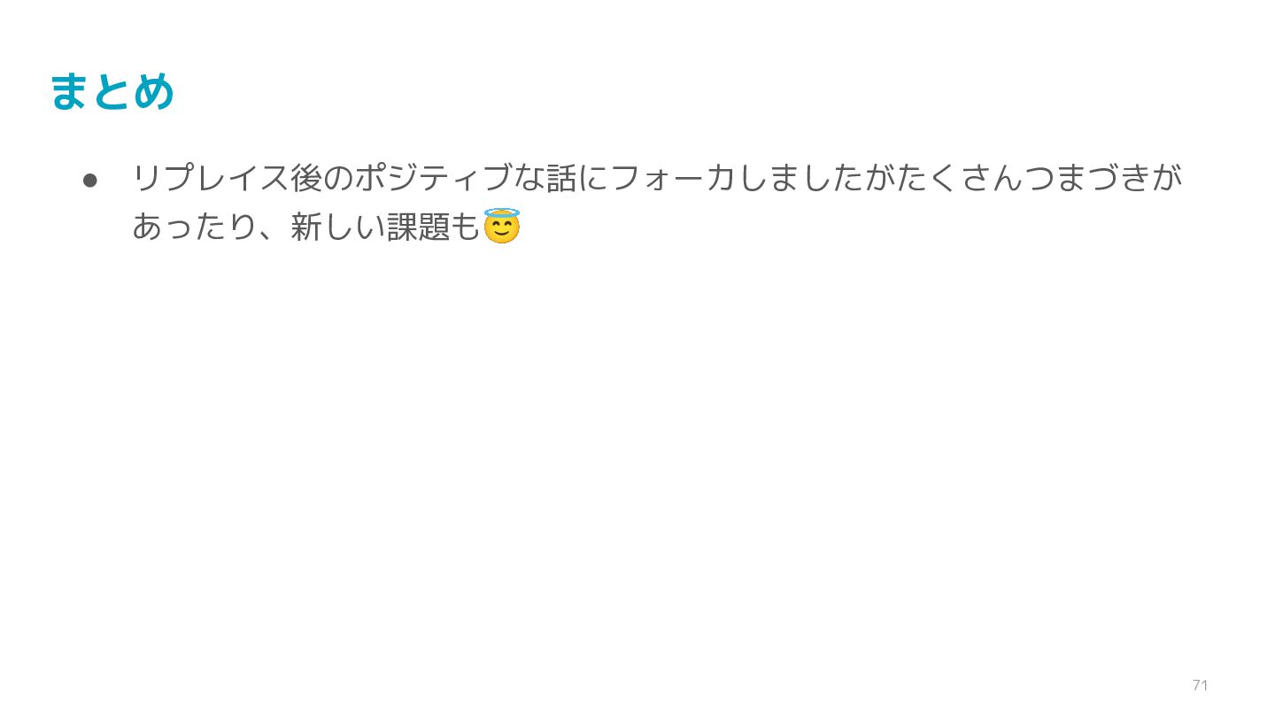 71 • リプレイス後のポジティブな話にフォーカしましたがたくさんつまづきが あったり、新しい課題も😇 まとめ
