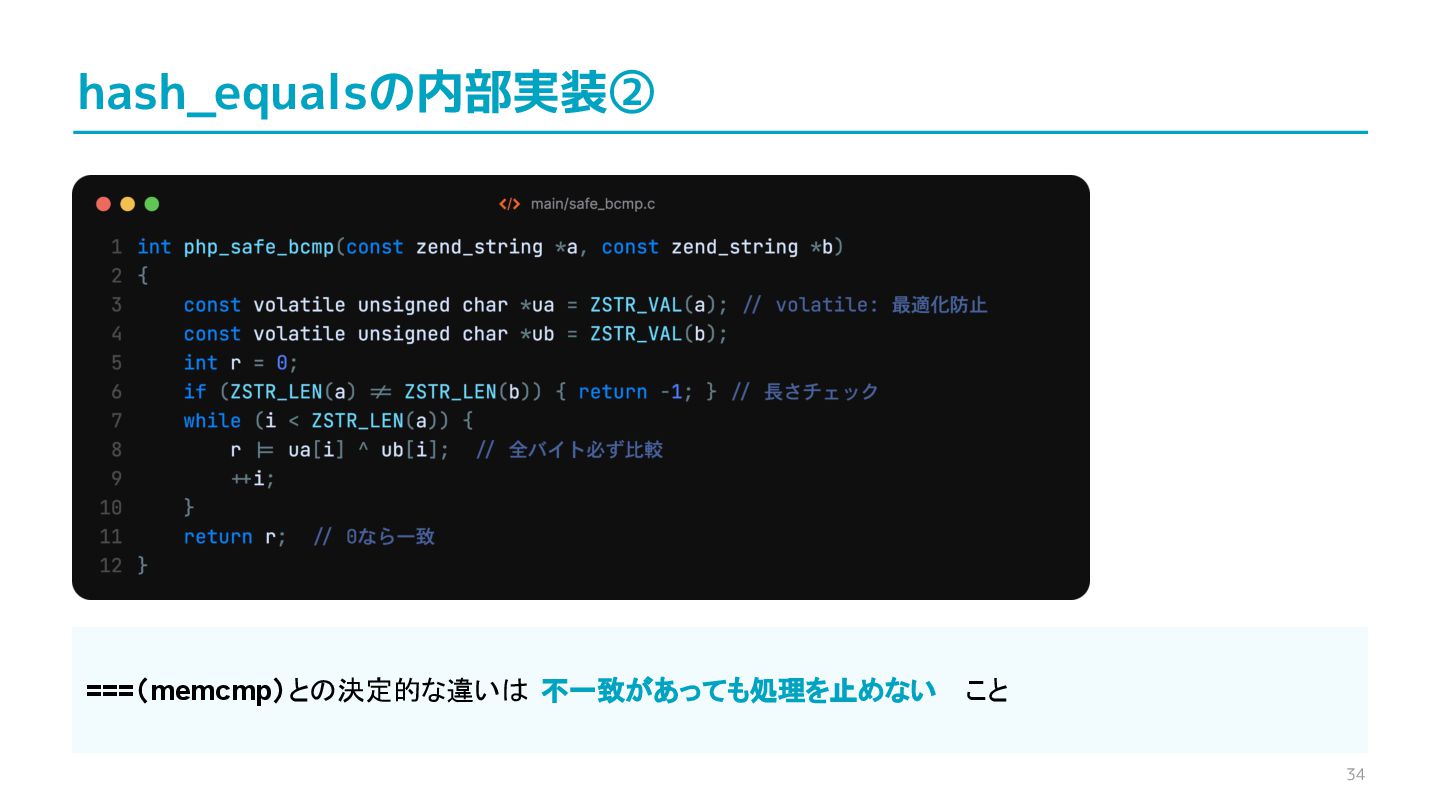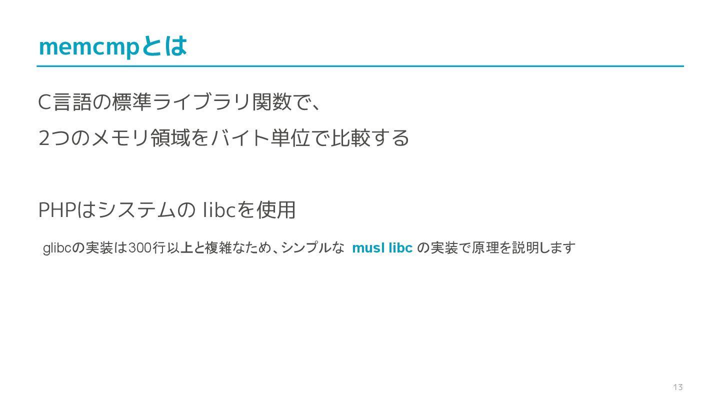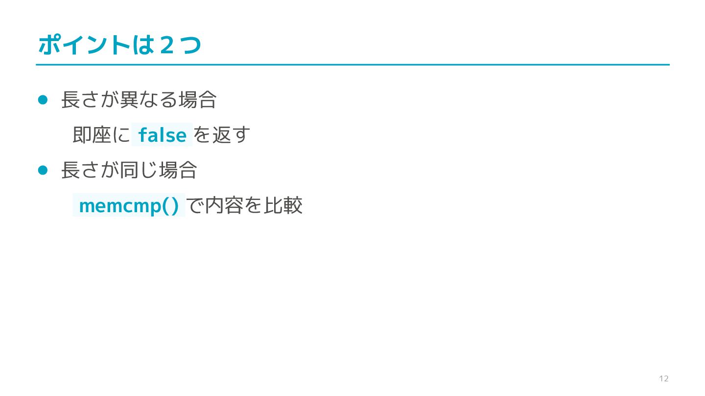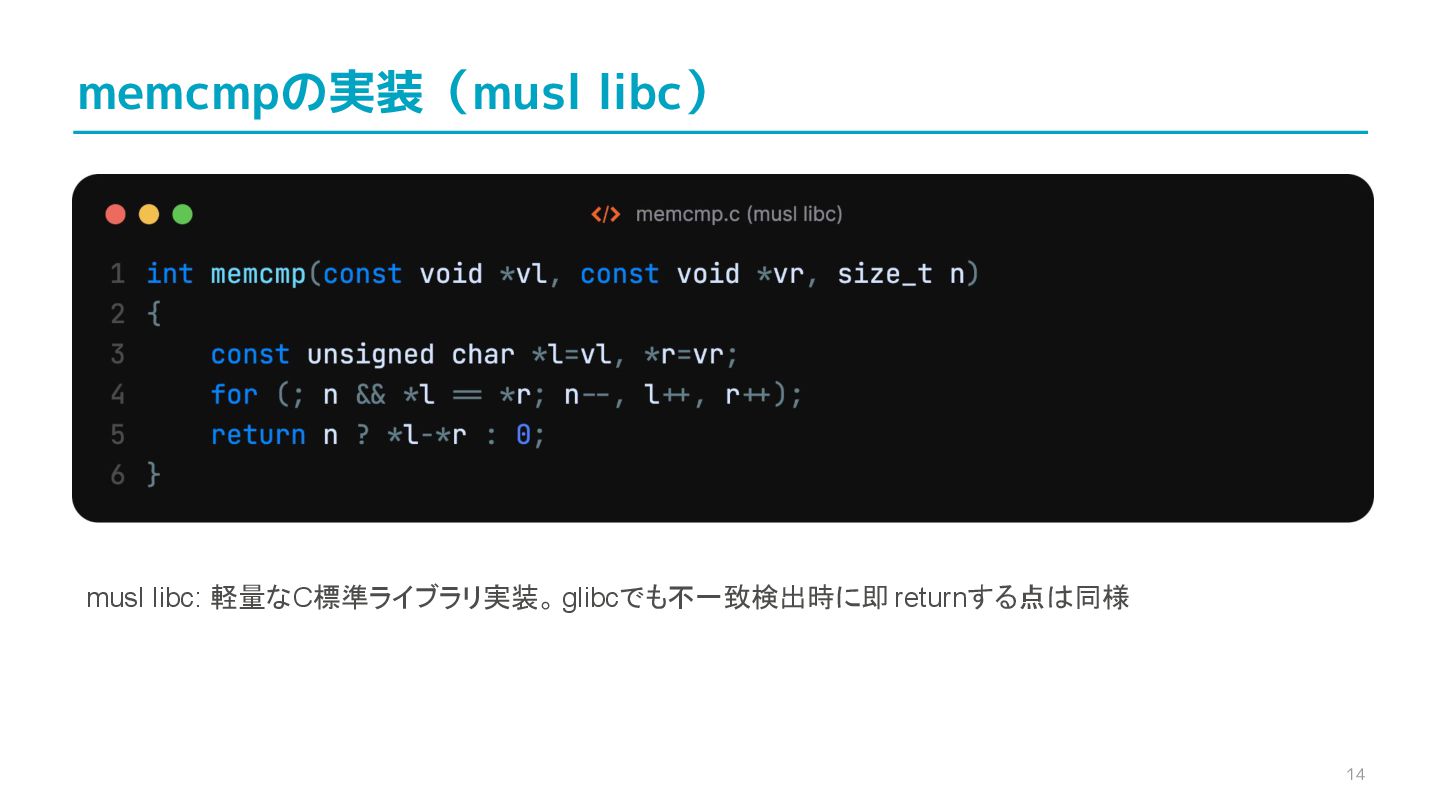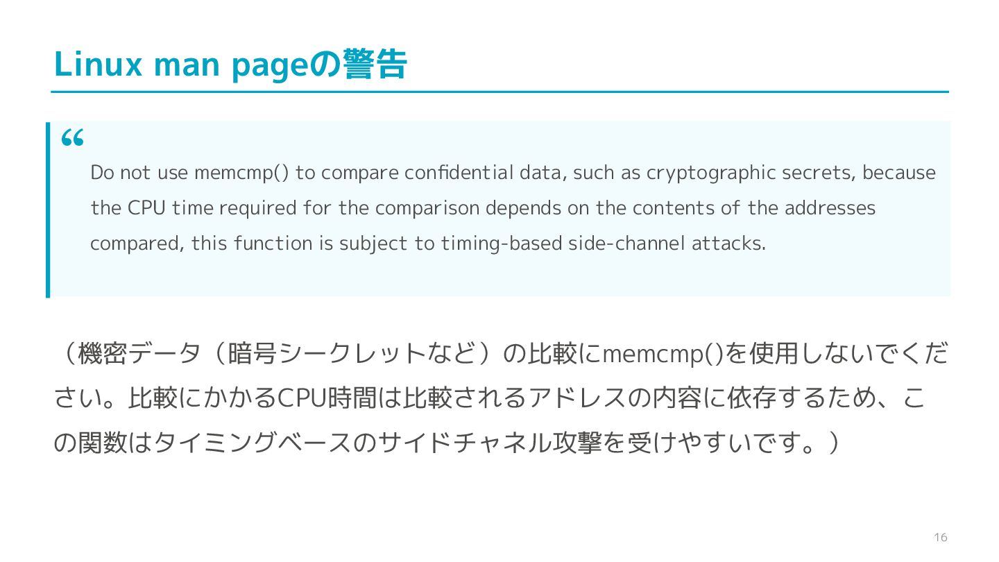 compare confidential data, such as cryptographic secrets, because the CPU time required for the comparison depends on the contents of the addresses compared, this function is subject to timing-based side-channel attacks. (機密データ(暗号シークレットなど)の比較にmemcmp()を使用しないでくだ さい。比較にかかるCPU時間は比較されるアドレスの内容に依存するため、こ の関数はタイミングベースのサイドチャネル攻撃を受けやすいです。)