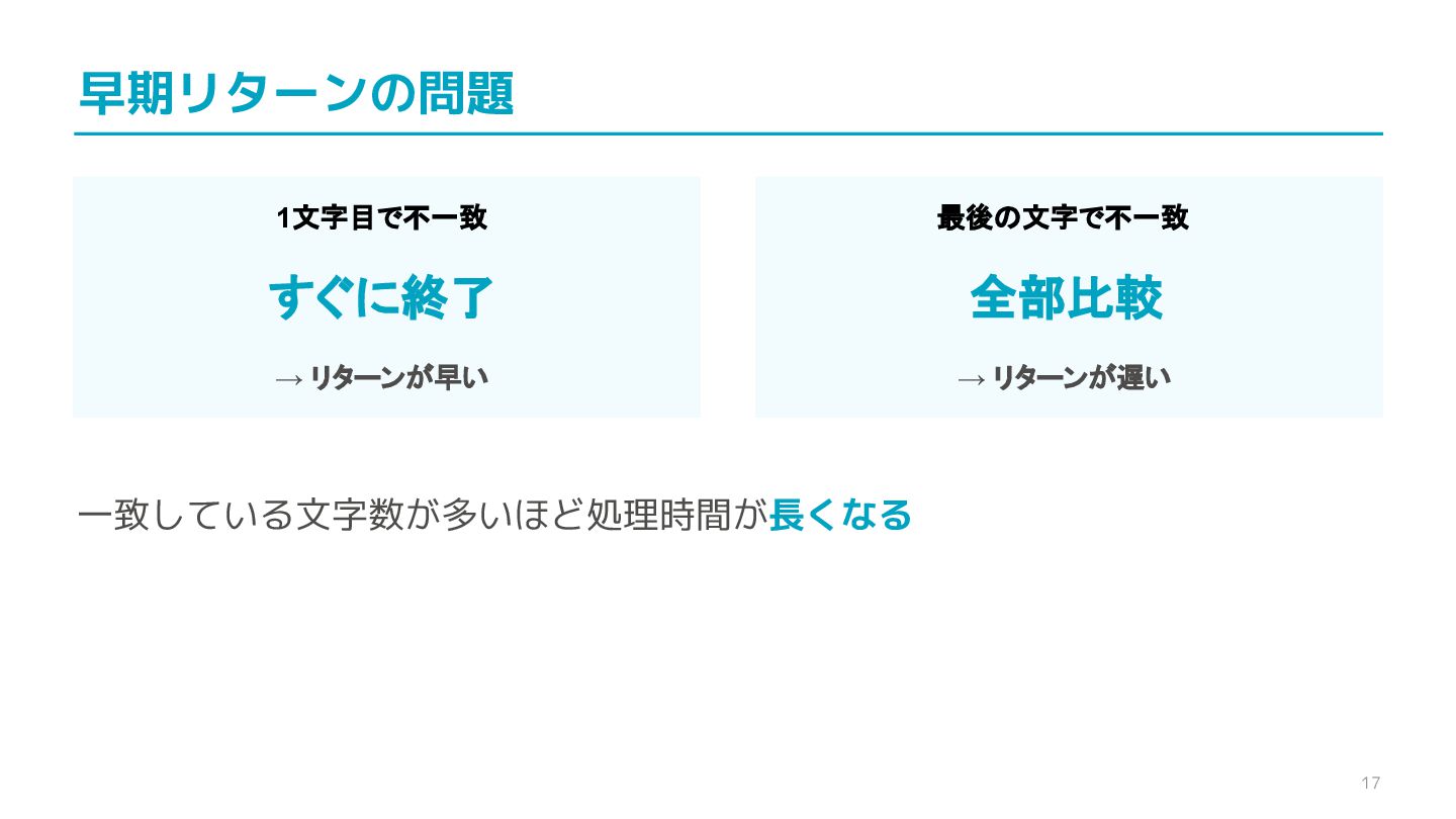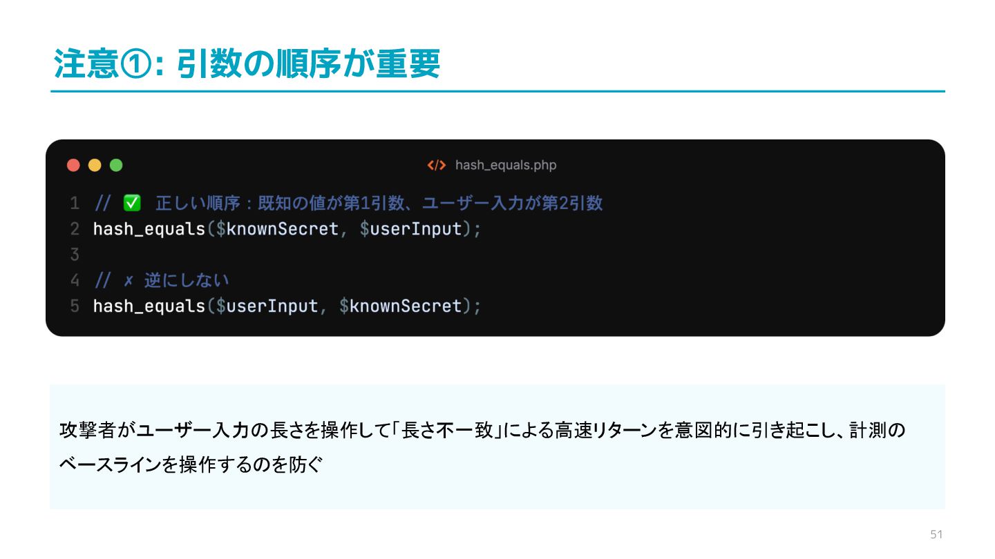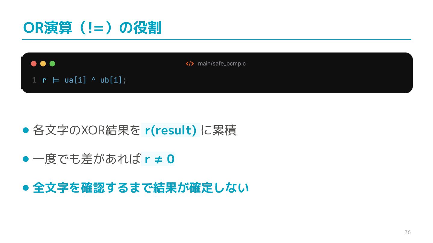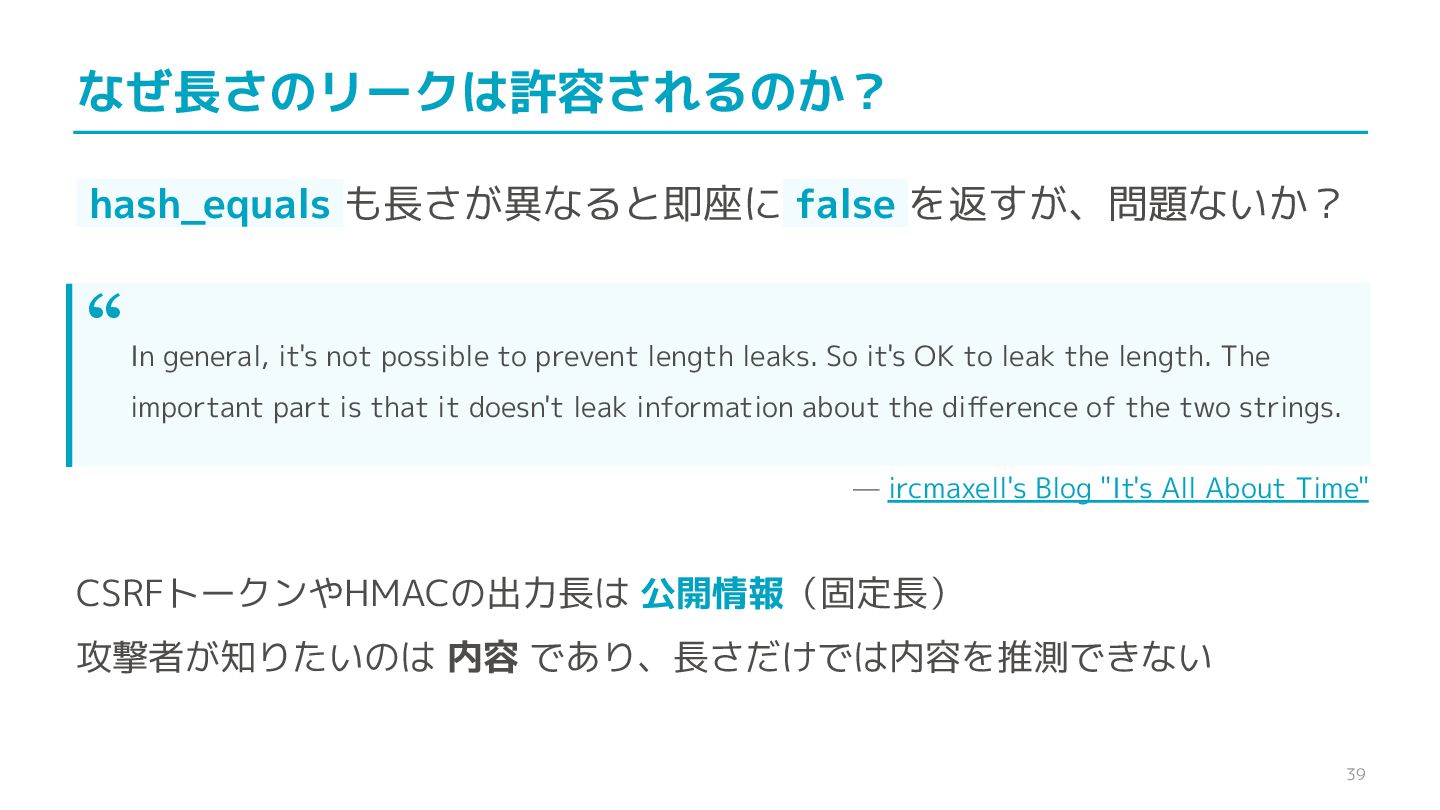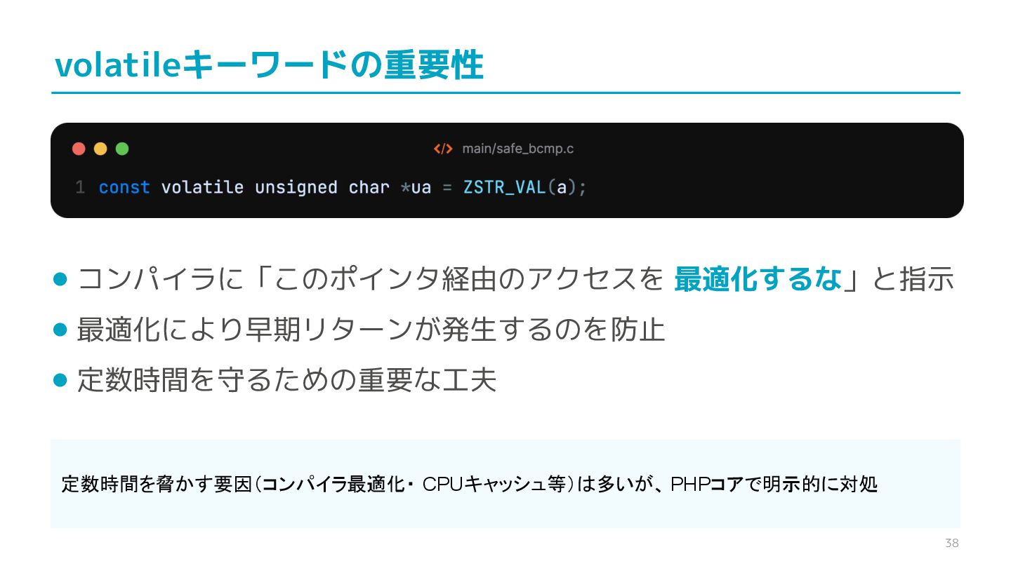 compare confidential data, such as cryptographic secrets, because the CPU time required for the comparison depends on the contents of the addresses compared, this function is subject to timing-based side-channel attacks. (機密データ(暗号シークレットなど)の比較にmemcmp()を使用しないでくだ さい。比較にかかるCPU時間は比較されるアドレスの内容に依存するため、こ の関数はタイミングベースのサイドチャネル攻撃を受けやすいです。)