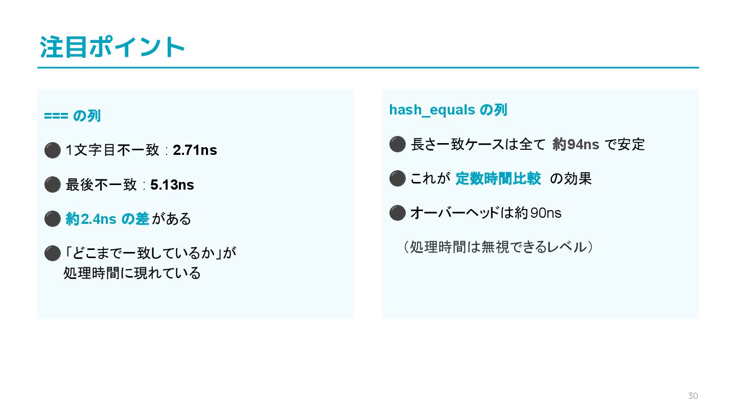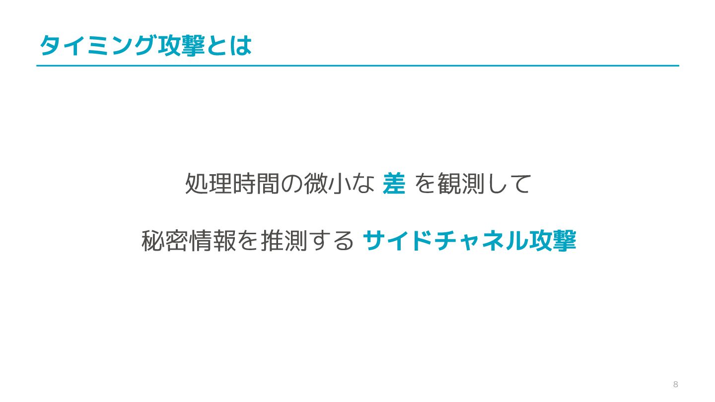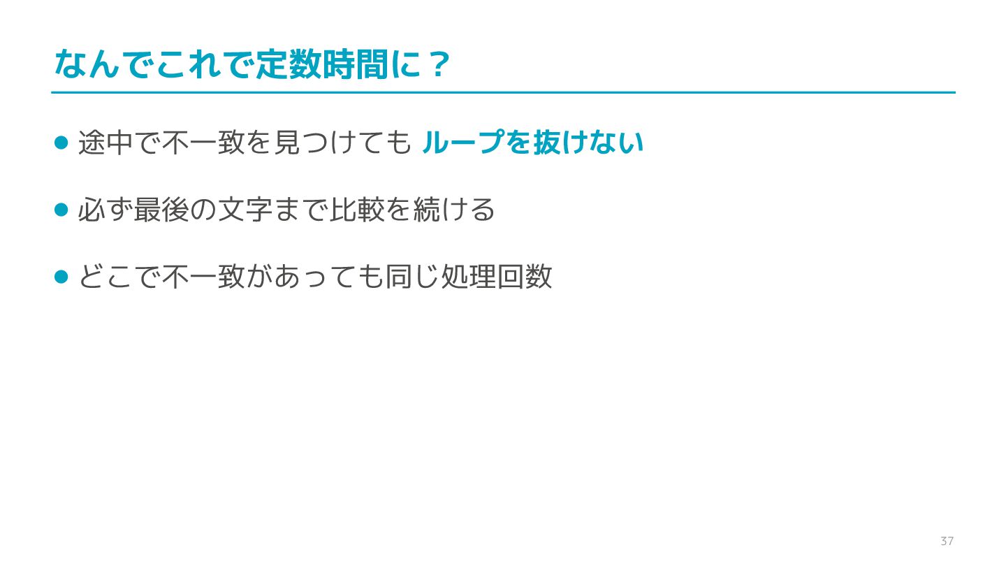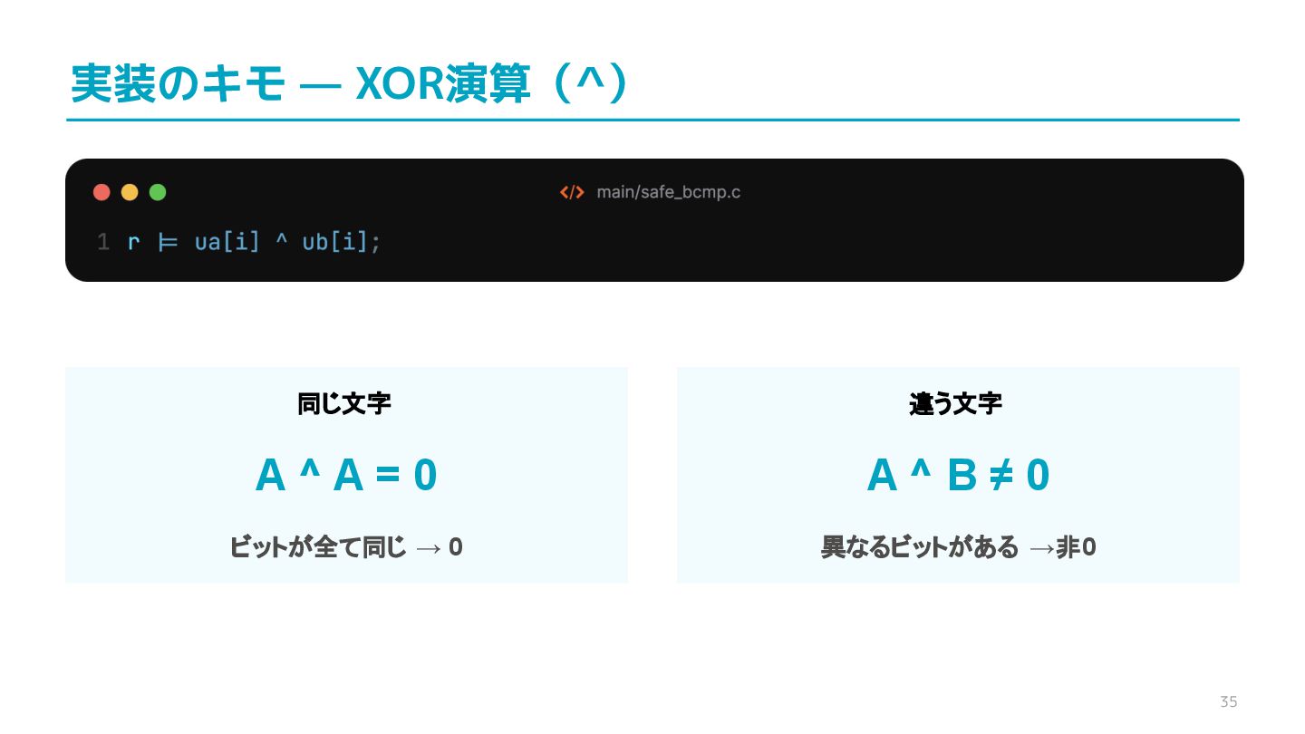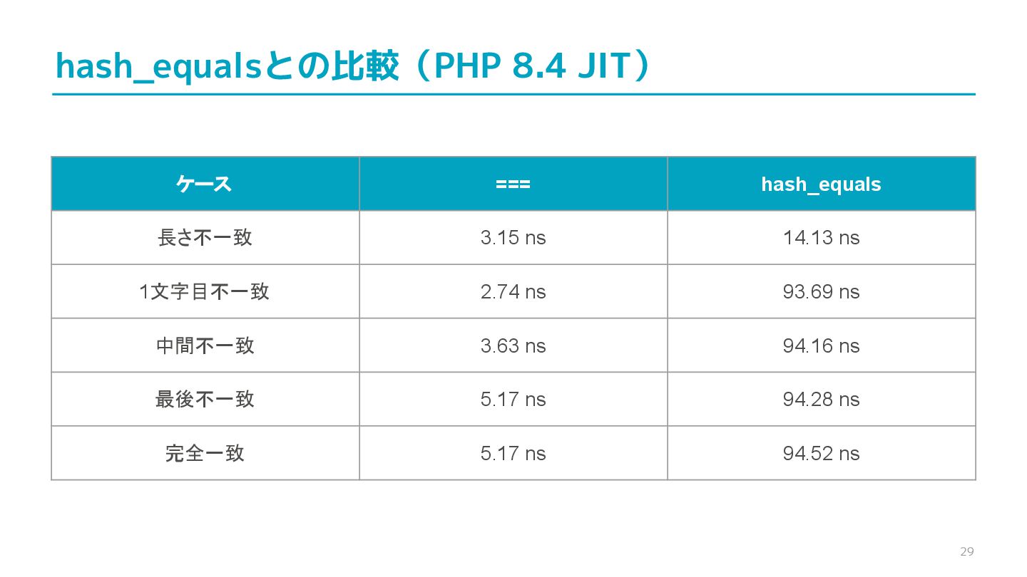 compare confidential data, such as cryptographic secrets, because the CPU time required for the comparison depends on the contents of the addresses compared, this function is subject to timing-based side-channel attacks. (機密データ(暗号シークレットなど)の比較にmemcmp()を使用しないでくだ さい。比較にかかるCPU時間は比較されるアドレスの内容に依存するため、こ の関数はタイミングベースのサイドチャネル攻撃を受けやすいです。)