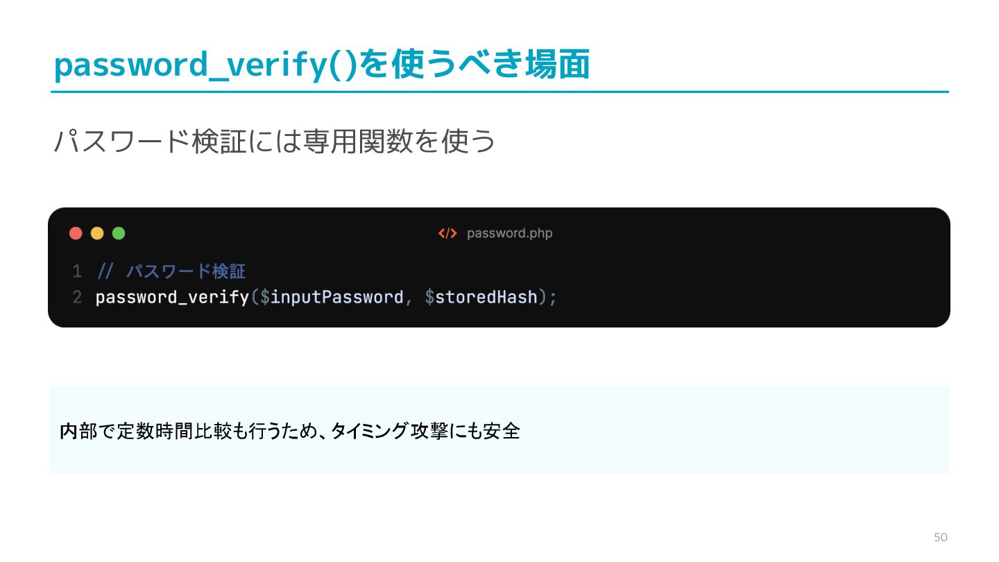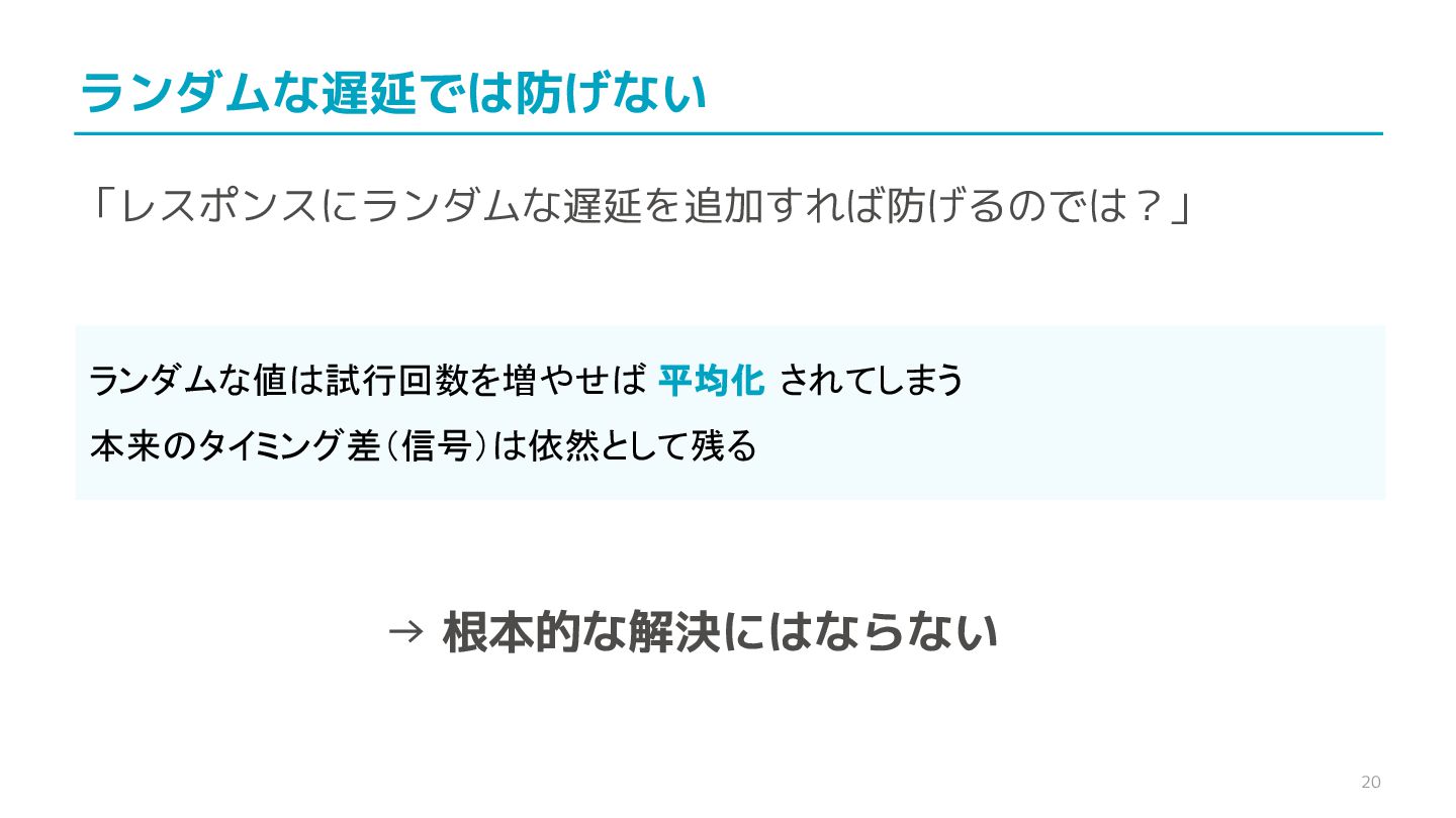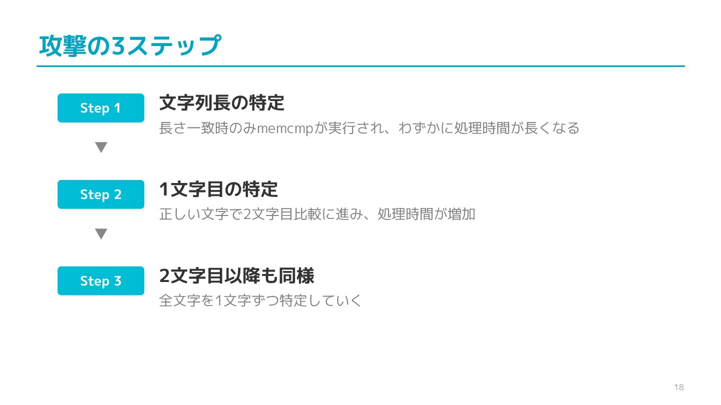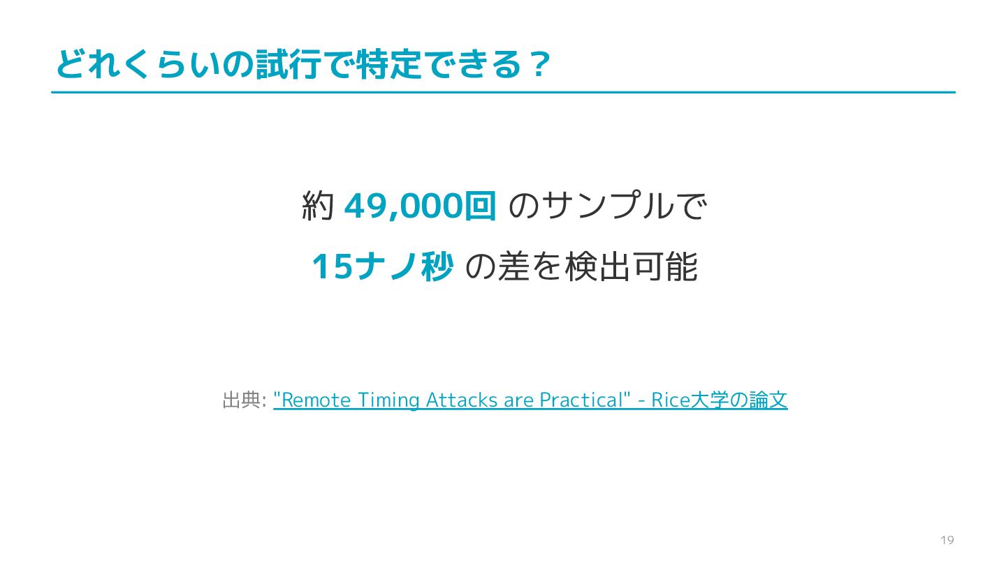 compare confidential data, such as cryptographic secrets, because the CPU time required for the comparison depends on the contents of the addresses compared, this function is subject to timing-based side-channel attacks. (機密データ(暗号シークレットなど)の比較にmemcmp()を使用しないでくだ さい。比較にかかるCPU時間は比較されるアドレスの内容に依存するため、こ の関数はタイミングベースのサイドチャネル攻撃を受けやすいです。)
