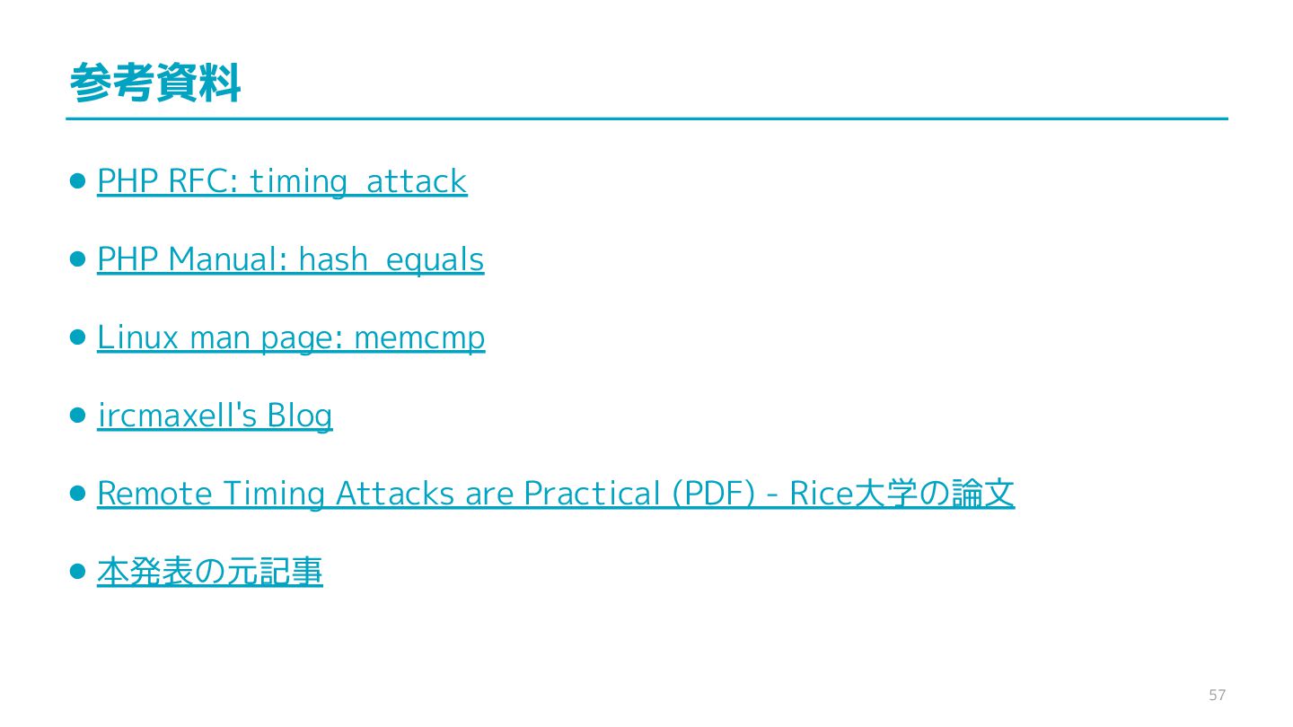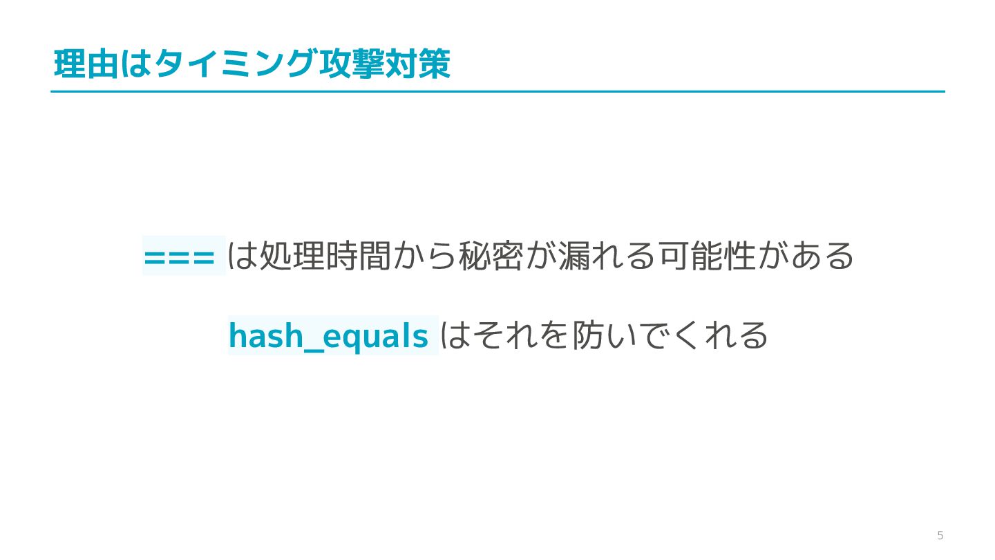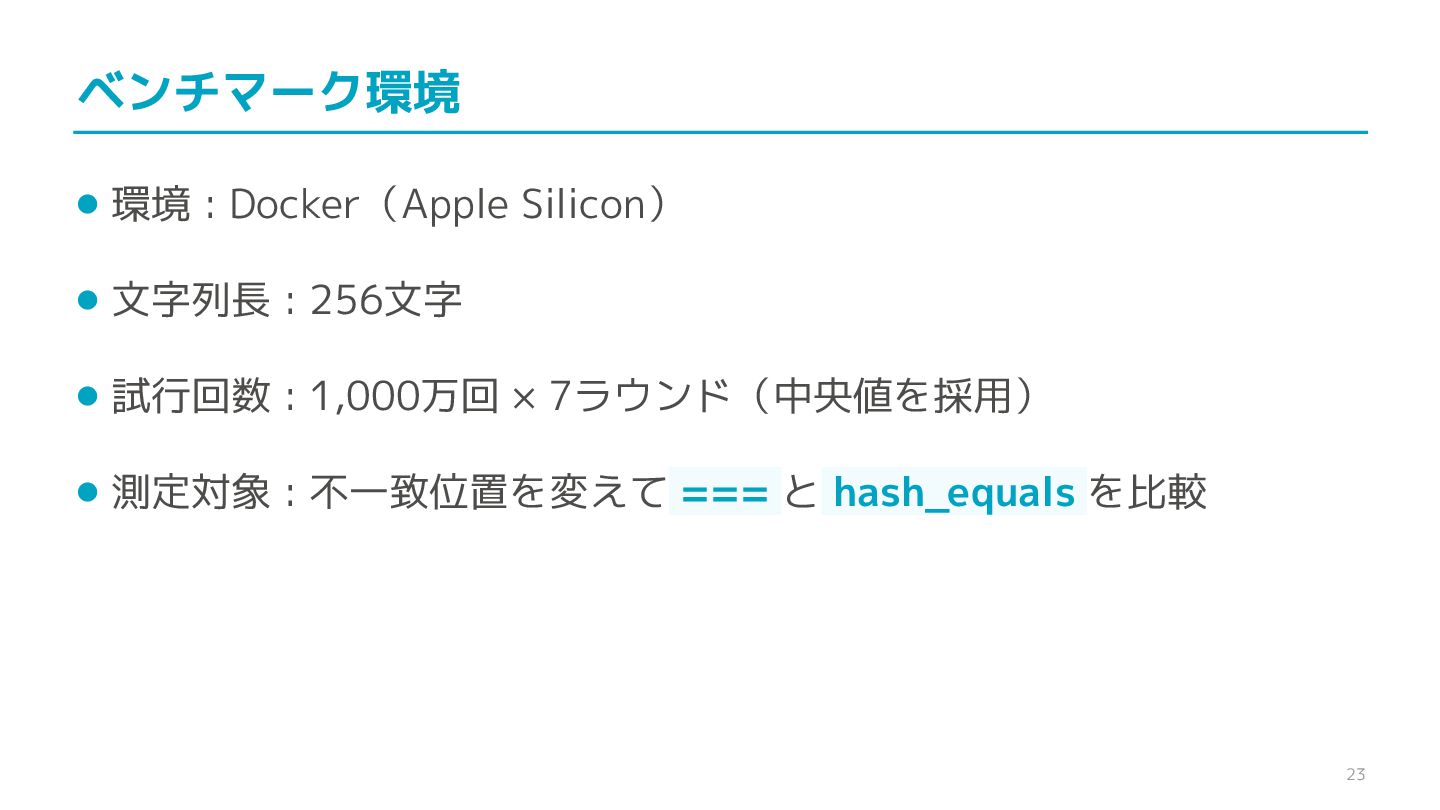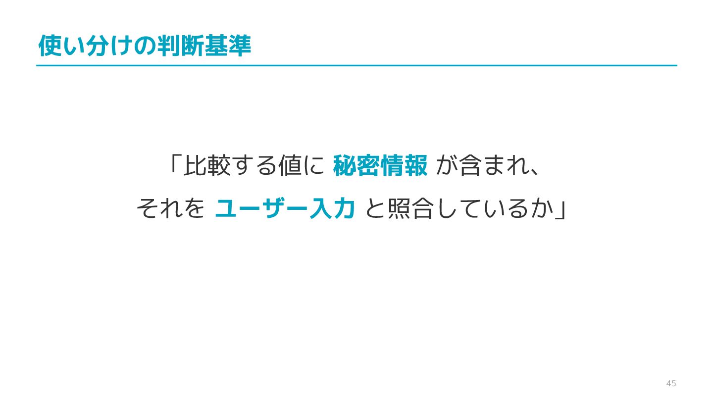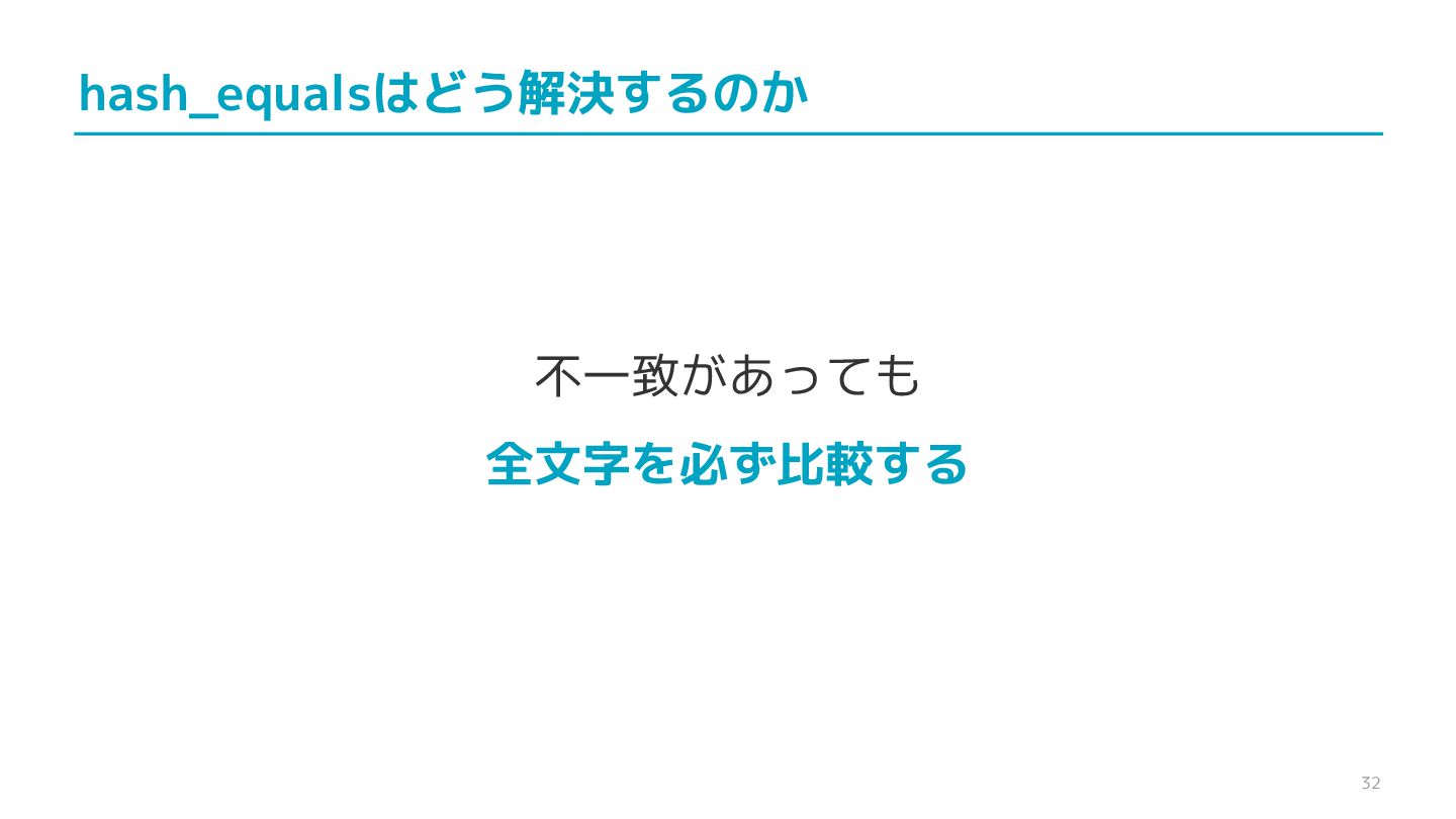 compare confidential data, such as cryptographic secrets, because the CPU time required for the comparison depends on the contents of the addresses compared, this function is subject to timing-based side-channel attacks. (機密データ(暗号シークレットなど)の比較にmemcmp()を使用しないでくだ さい。比較にかかるCPU時間は比較されるアドレスの内容に依存するため、こ の関数はタイミングベースのサイドチャネル攻撃を受けやすいです。)