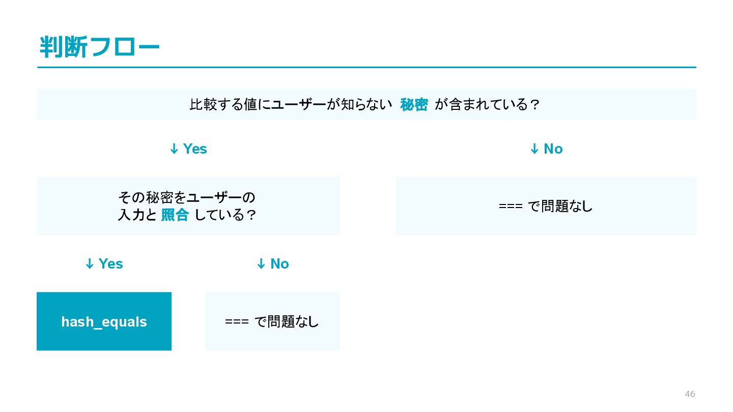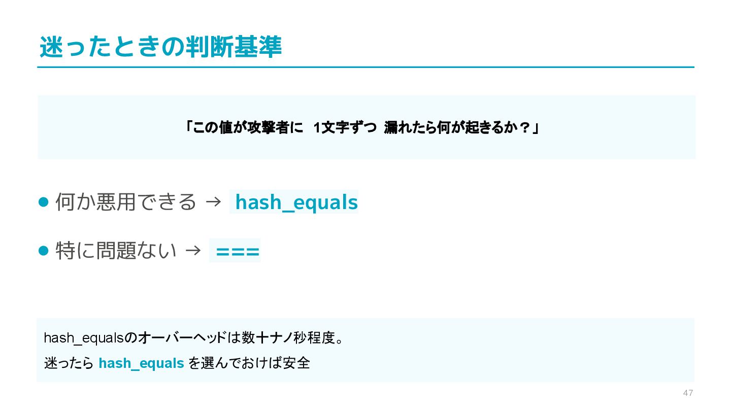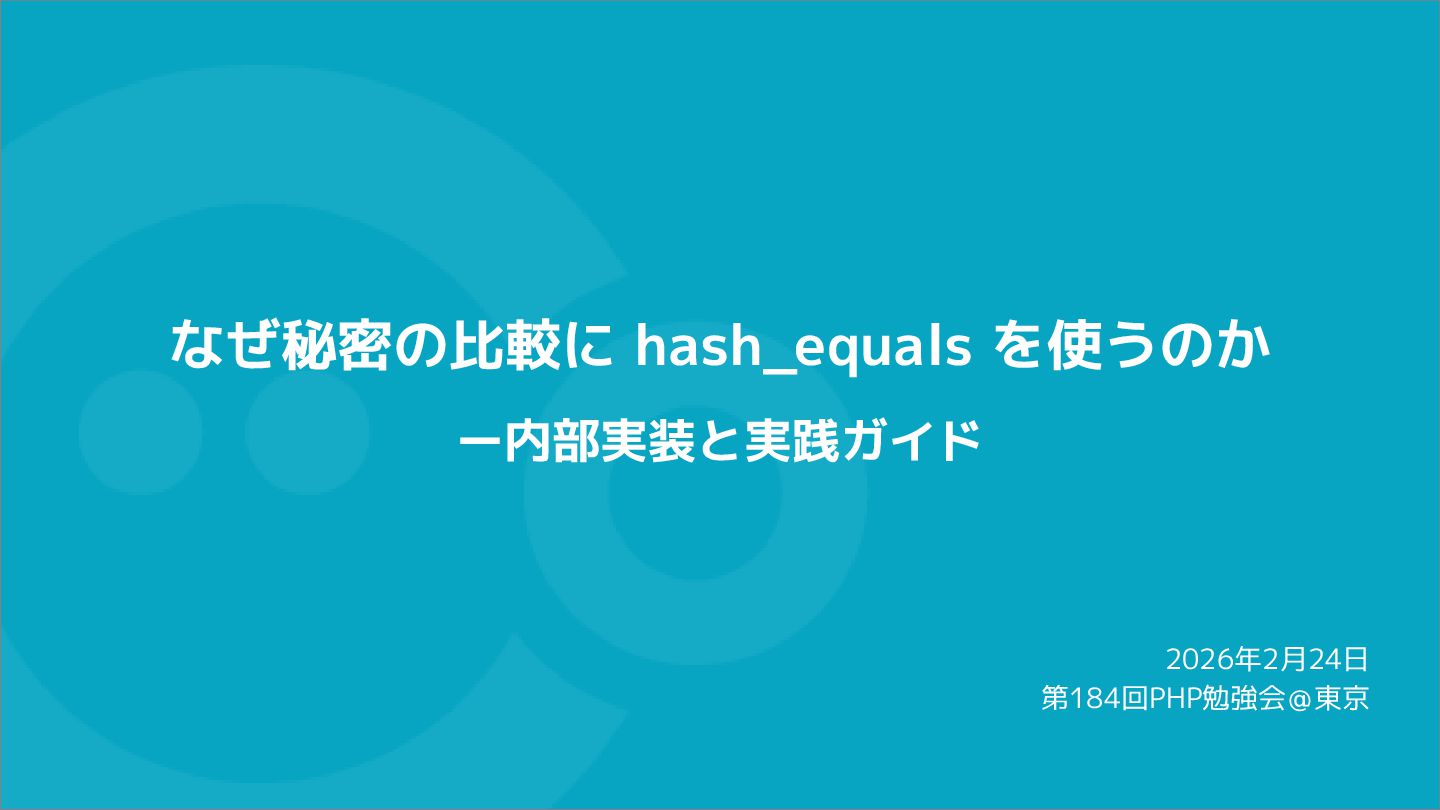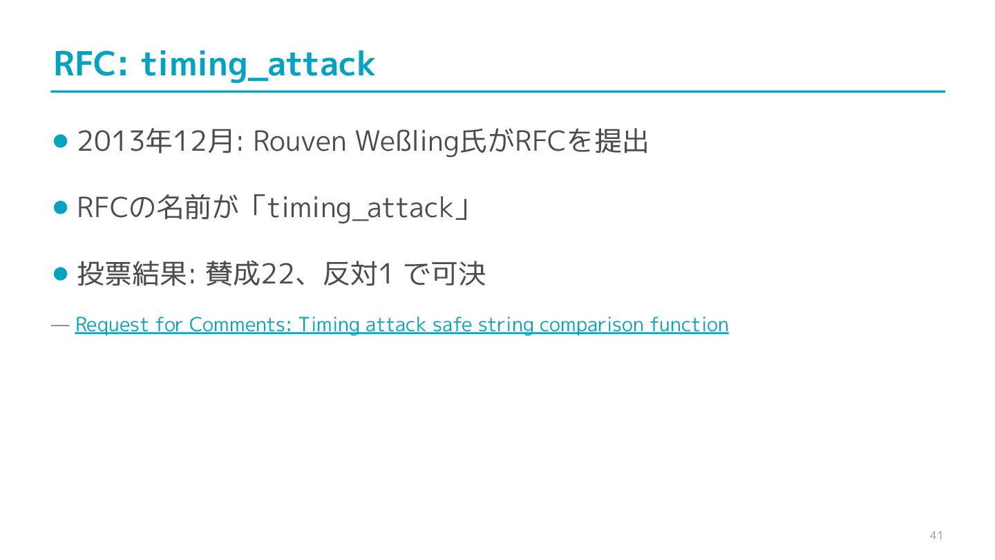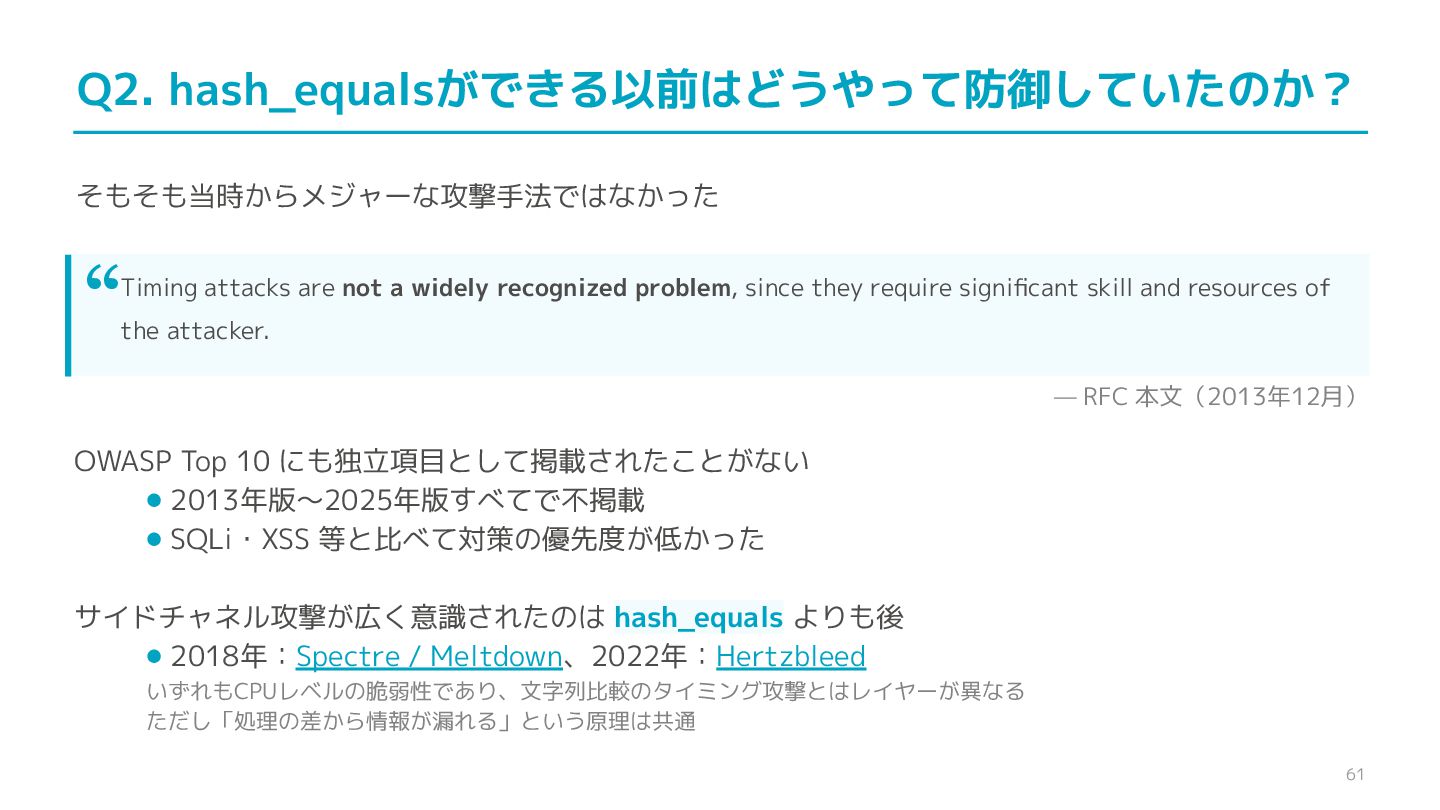 compare confidential data, such as cryptographic secrets, because the CPU time required for the comparison depends on the contents of the addresses compared, this function is subject to timing-based side-channel attacks. (機密データ(暗号シークレットなど)の比較にmemcmp()を使用しないでくだ さい。比較にかかるCPU時間は比較されるアドレスの内容に依存するため、こ の関数はタイミングベースのサイドチャネル攻撃を受けやすいです。)