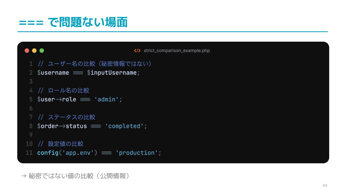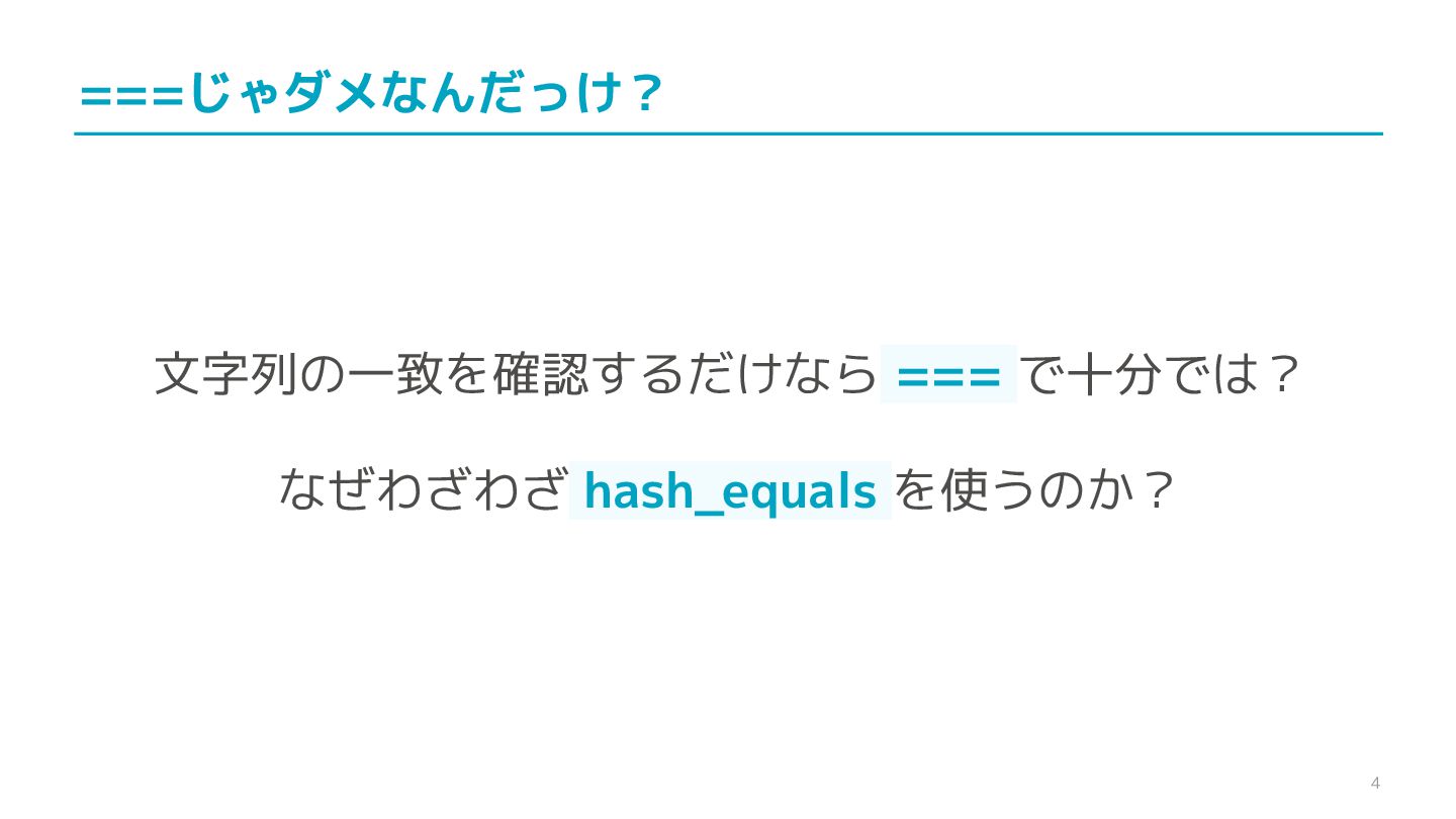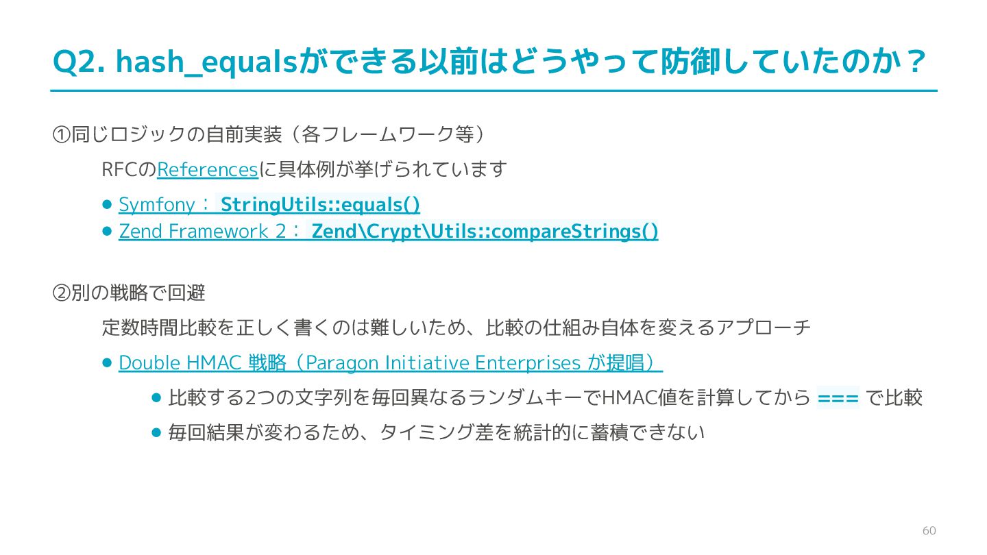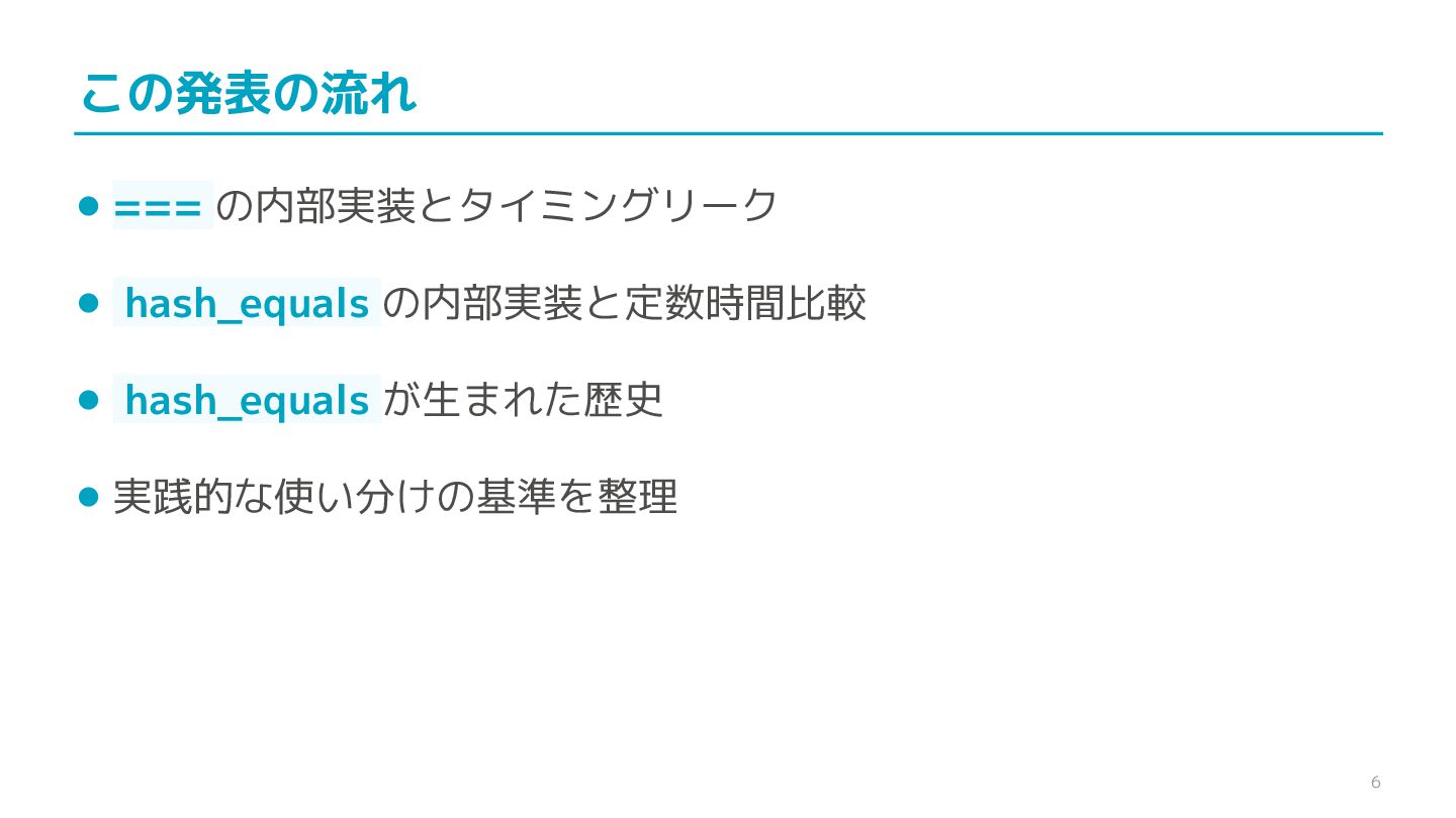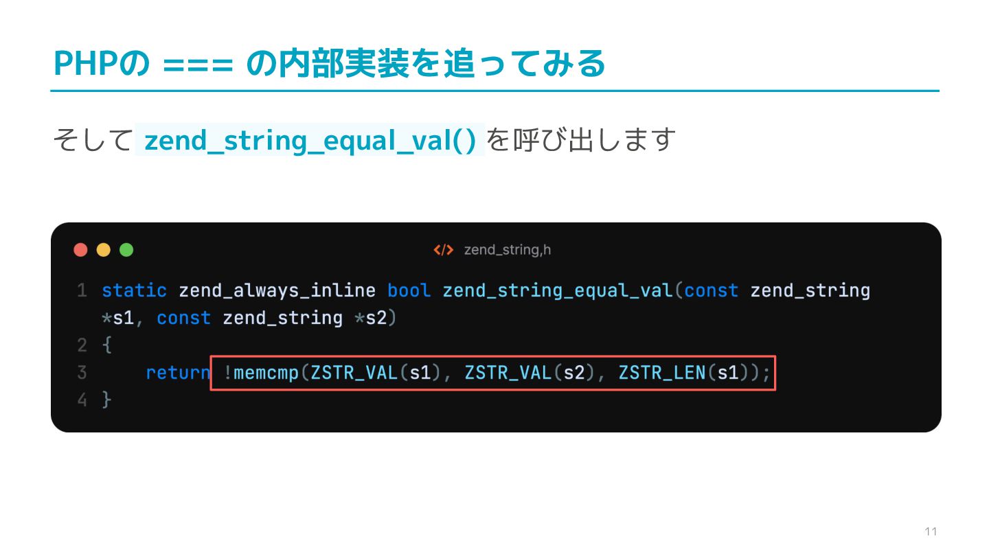 compare confidential data, such as cryptographic secrets, because the CPU time required for the comparison depends on the contents of the addresses compared, this function is subject to timing-based side-channel attacks. (機密データ(暗号シークレットなど)の比較にmemcmp()を使用しないでくだ さい。比較にかかるCPU時間は比較されるアドレスの内容に依存するため、こ の関数はタイミングベースのサイドチャネル攻撃を受けやすいです。)