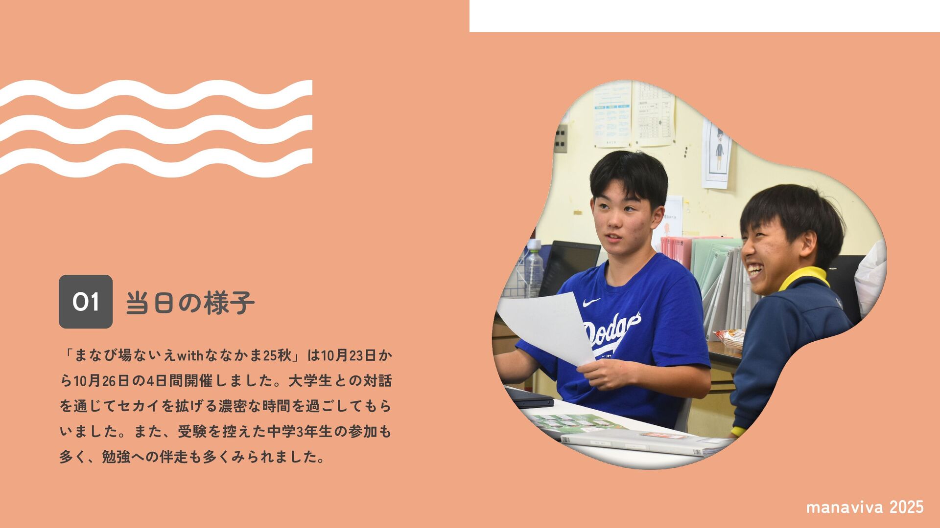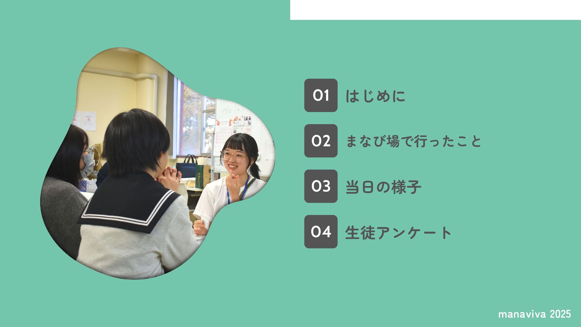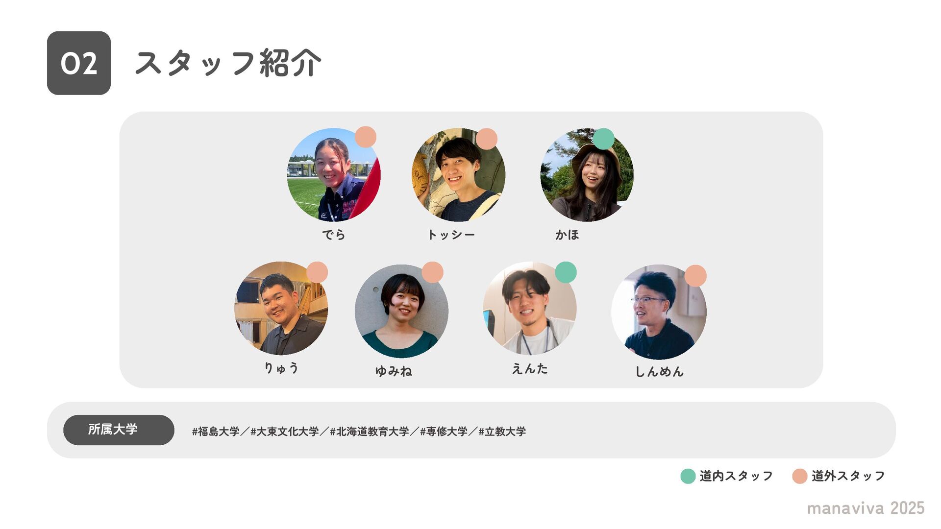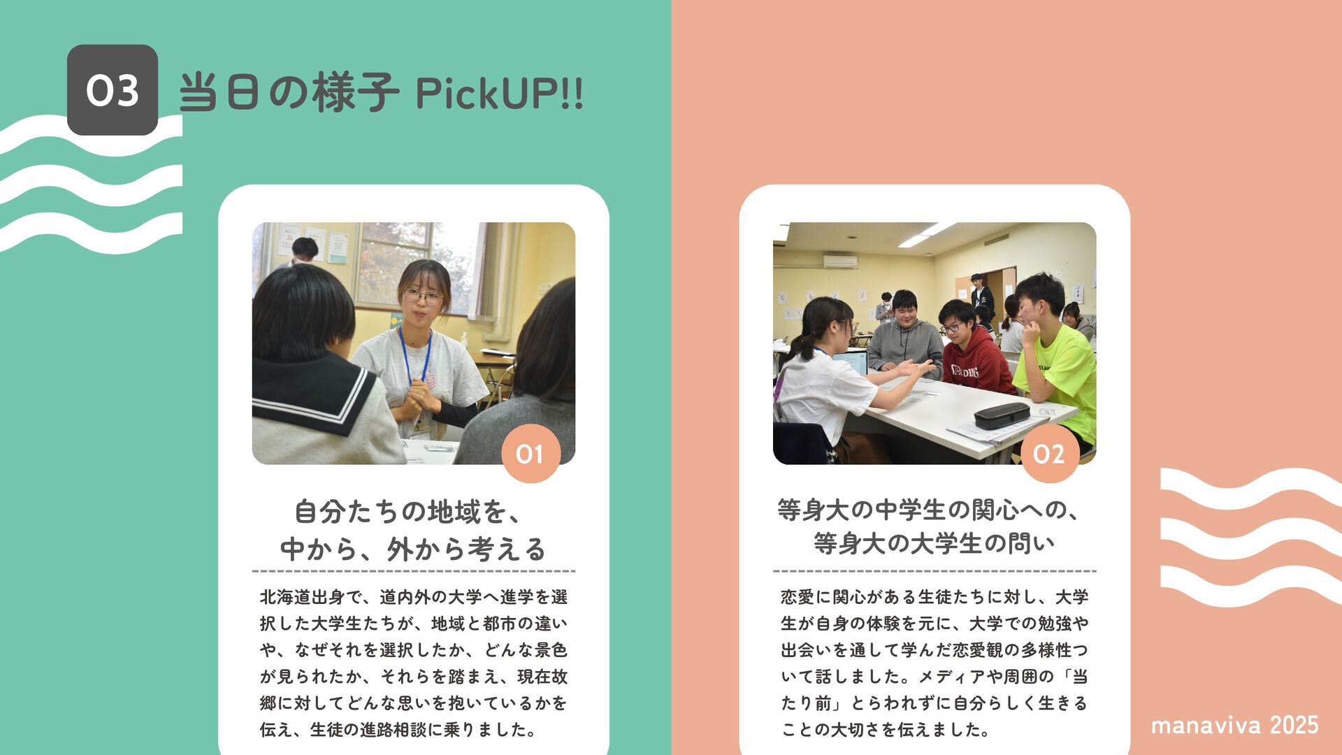 2. 01 02 当日の様子 PickUP!! 03 manaviva 2025 北海道出身で、道内外の大学へ進学を選 択した大学生たちが、地域と都市の違い や、なぜそれを選択したか、どんな景色