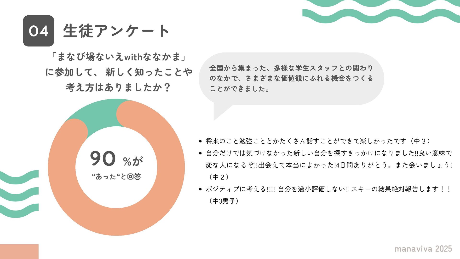 のなかで、さまざまな価値観にふれる機会をつくる ことができました。 将来のこと勉強こととかたくさん話すことができて楽しかったです(中3) 自分だけでは気づけなかった新しい自分を探すきっかけになりました!!良い意味で 変な人になるぞ!!出会えて本当によかった!4日間ありがとう。また会いましょう! (中2) ポジティブに考える!!!!! 自分を過小評価しない!! スキーの結果絶対報告します!! (中3男子) manaviva 2025