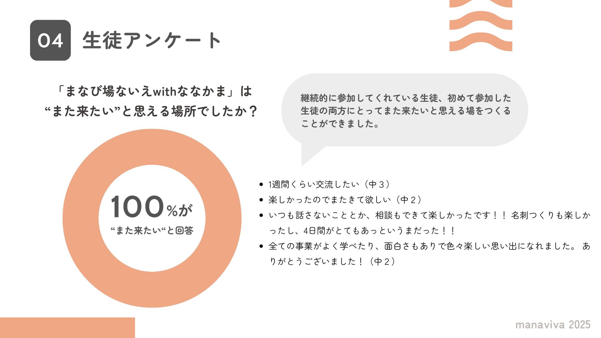 6. 生徒アンケート 04 「まなび場ないえwithななかま」は “また来たい”と思える場所でしたか? 100%が “また来たい“と回答 manaviva 2025 継続的に参加してくれている生徒、初めて参加した 生徒の両方にとってまた来たいと思える場をつくる