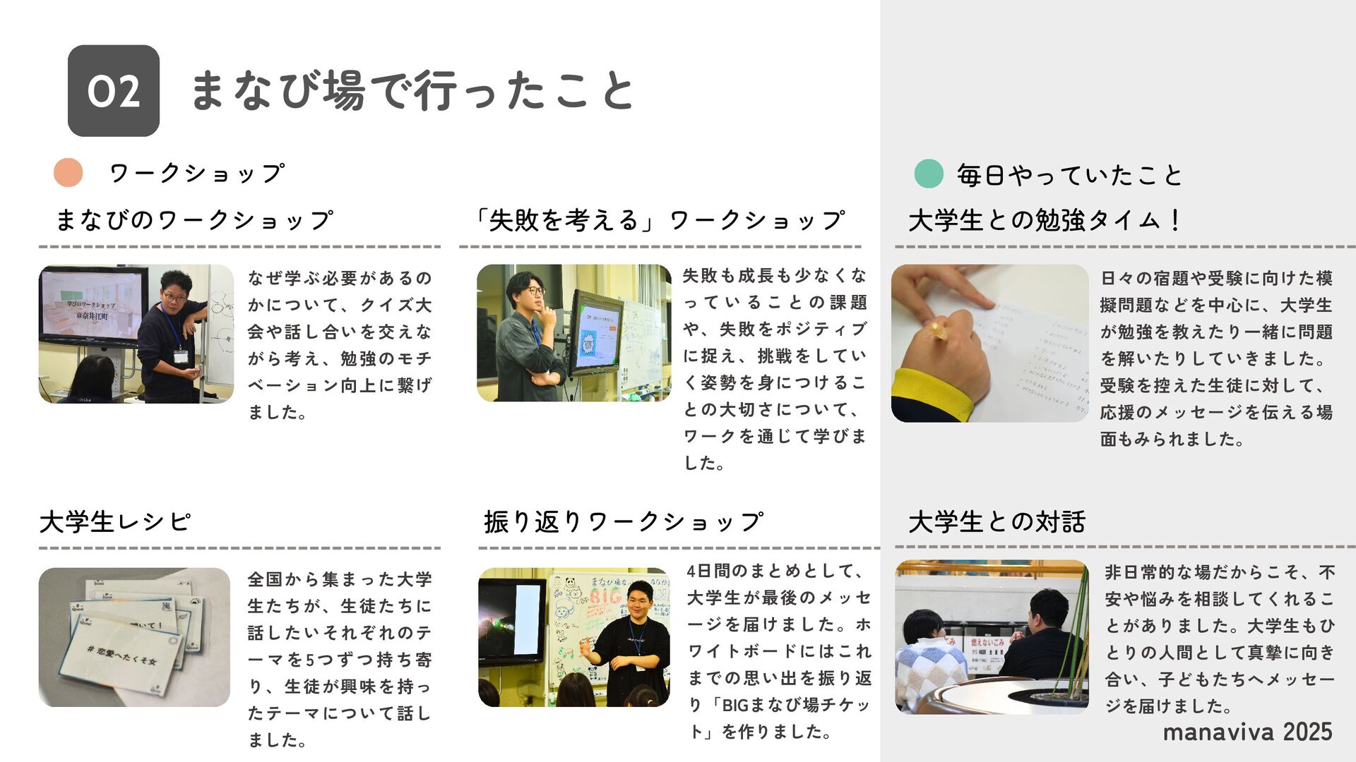 て い る こ と の 課 題 や、失敗をポジティブ に捉え、挑戦をしてい く姿勢を身につけるこ との大切さについて、 ワークを通じて学びま した。 全国から集まった大学 生たちが、生徒たちに 話したいそれぞれのテ ー マ を 5 つ ず つ 持 ち 寄 り、生徒が興味を持っ たテーマについて話し ました。 日々の宿題や受験に向けた模 擬問題などを中心に、大学生 が勉強を教えたり一緒に問題 を解いたりしていきました。 受験を控えた生徒に対して、 応援のメッセージを伝える場 面もみられました。 非日常的な場だからこそ、不 安や悩みを相談してくれるこ とがありました。大学生もひ とりの人間として真摯に向き 合い、子どもたちへメッセー ジを届けました。 まなびのワークショップ 「失敗を考える」ワークショップ 大学生との勉強タイム! 大学生との対話 ワークショップ 毎日やっていたこと 02 manaviva 2025 4日間のまとめとして、 大学生が最後のメッセ ージを届けました。ホ ワイトボードにはこれ までの思い出を振り返 り「BIGまなび場チケッ ト」を作りました。 振り返りワークショップ