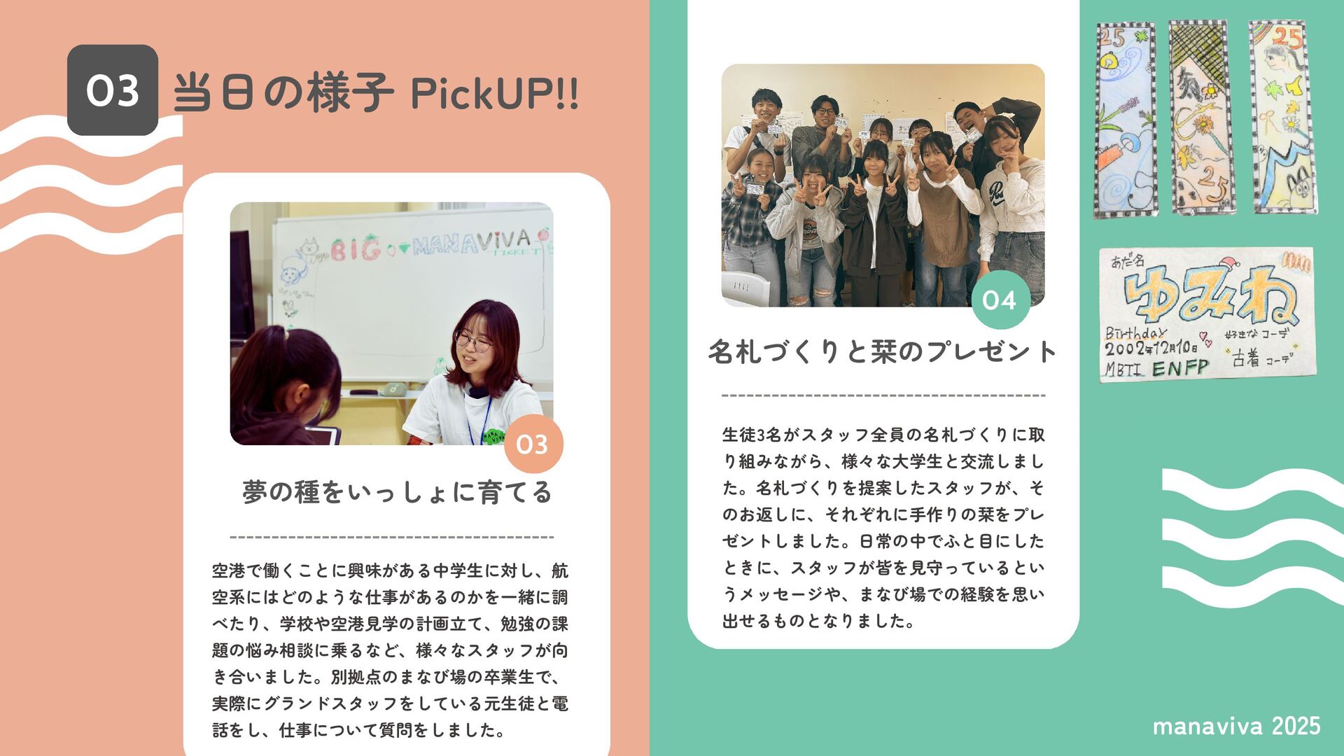 3. 03 04 当日の様子 PickUP!! 03 manaviva 2025 空港で働くことに興味がある中学生に対し、航 空系にはどのような仕事があるのかを一緒に調 べたり、学校や空港見学の計画立て、勉強の課