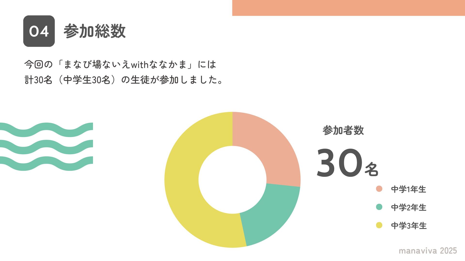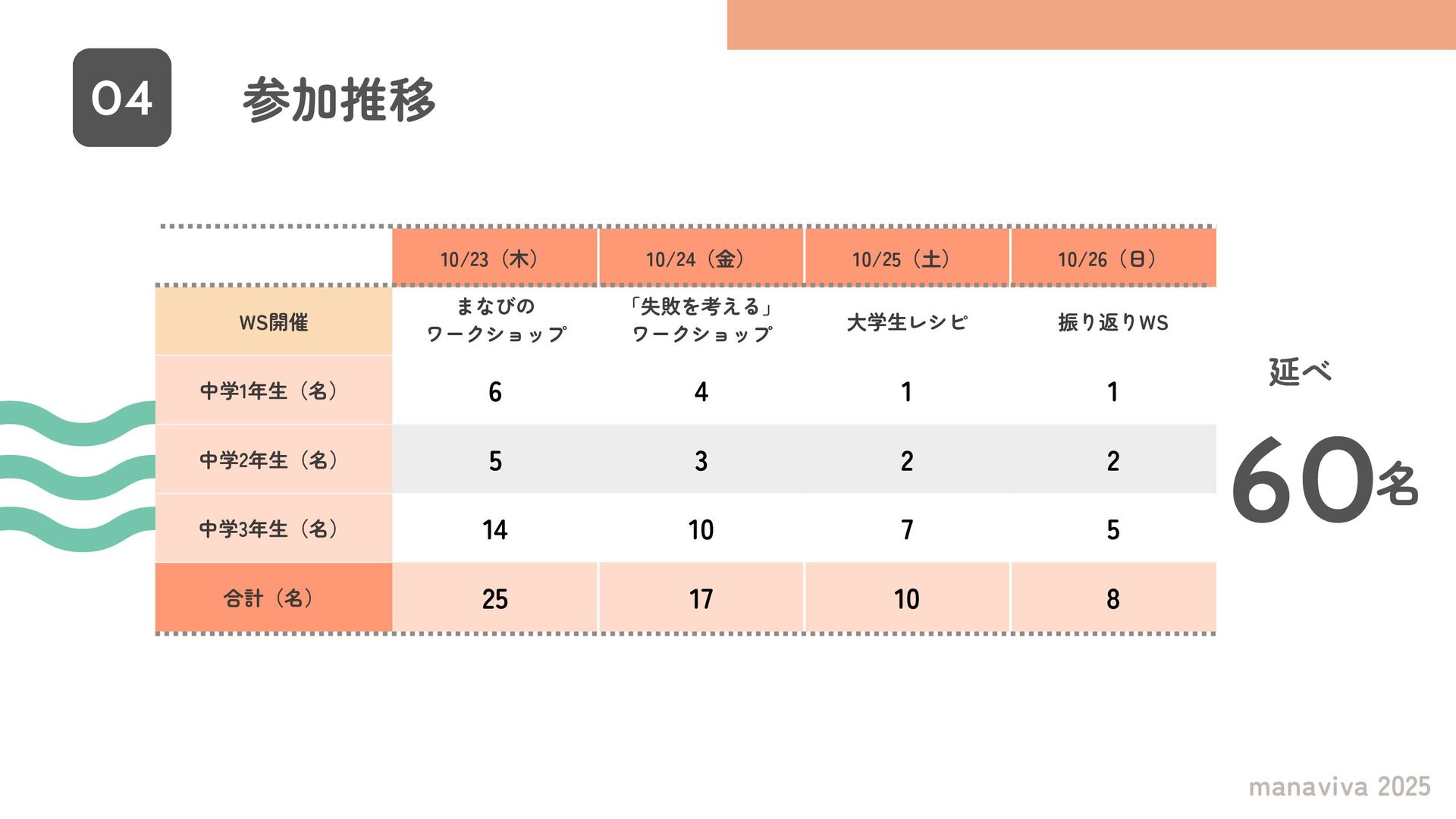 振り返りWS 中学1年生(名) 6 4 1 1 中学2年生(名) 5 3 2 2 中学3年生(名) 14 10 7 5 合計(名) 25 17 10 8 参加推移 04 60名 延べ manaviva 2025