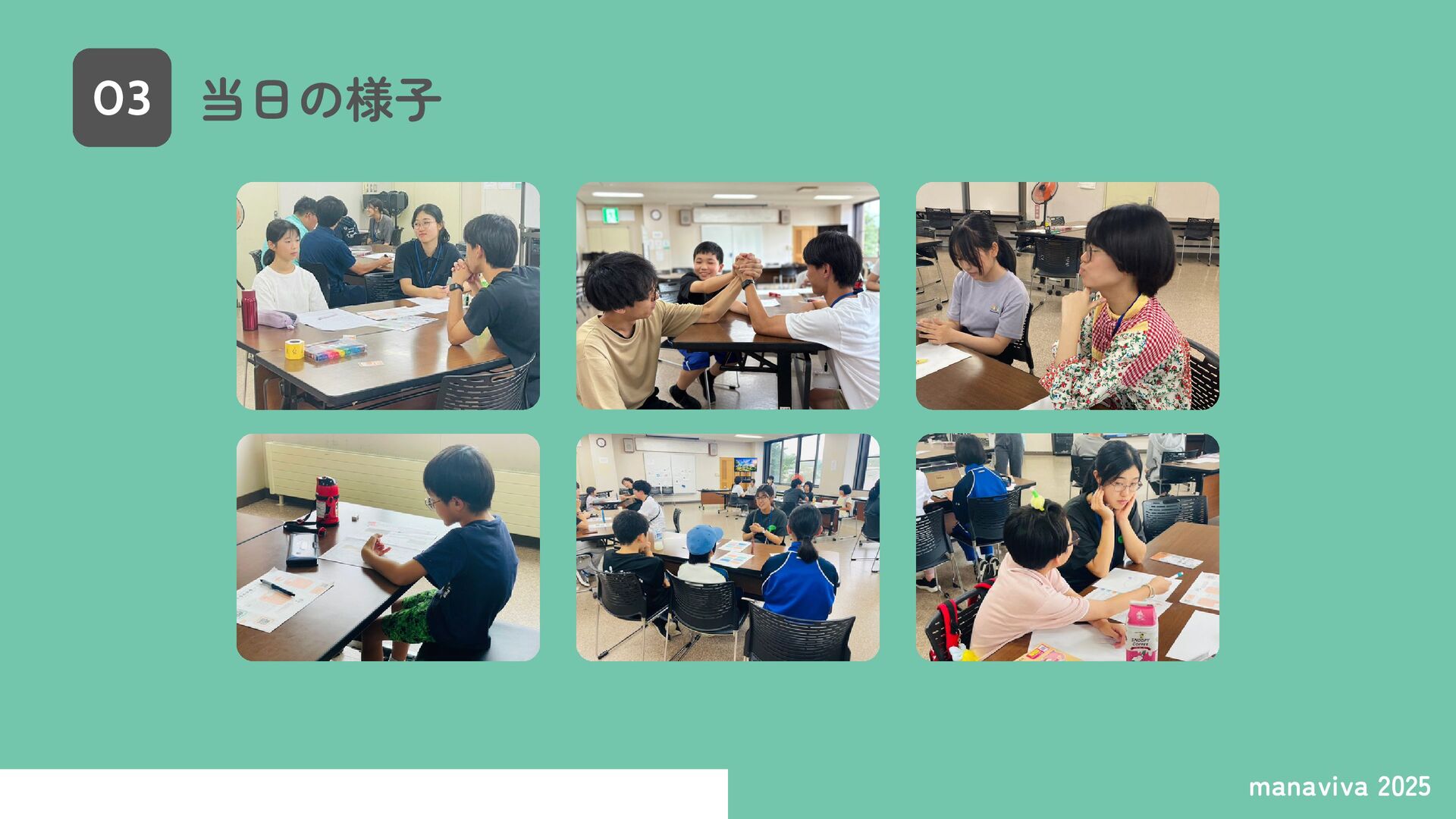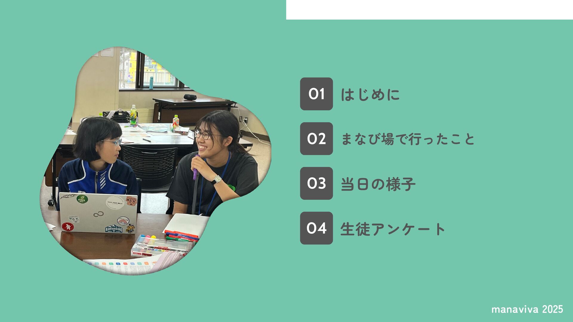 はじめに 当日の様子 まなび場で行ったこと 生徒アンケート 01 03 02 04 manaviva 2025