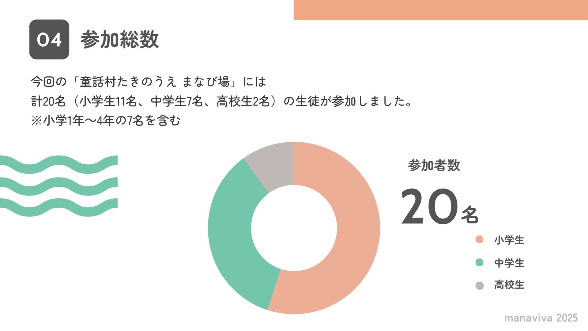 参加総数 04 小学生 高校生 今回の「童話村たきのうえ まなび場」には 計20名(小学生11名、中学生7名、高校生2名)の生徒が参加しました。 ※小学1年 ~4年の7名を含む manaviva