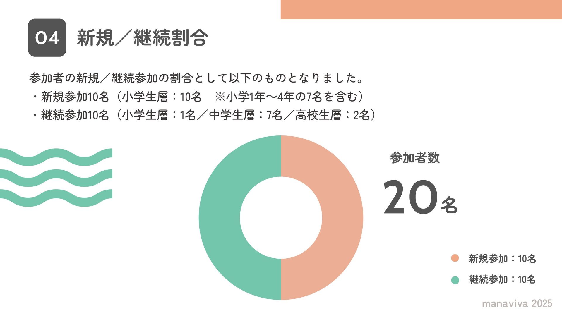 新規/継続割合 04 20名 参加者数 継続参加:10名 参加者の新規/継続参加の割合として以下のものとなりました。 ・新規参加10名(小学生層:10名 ※小学1年 ~4年の7名を含む) ・継続参加10名(小学生層:1名/中学生層:7名/高校生層:2名) 新規参加:10名