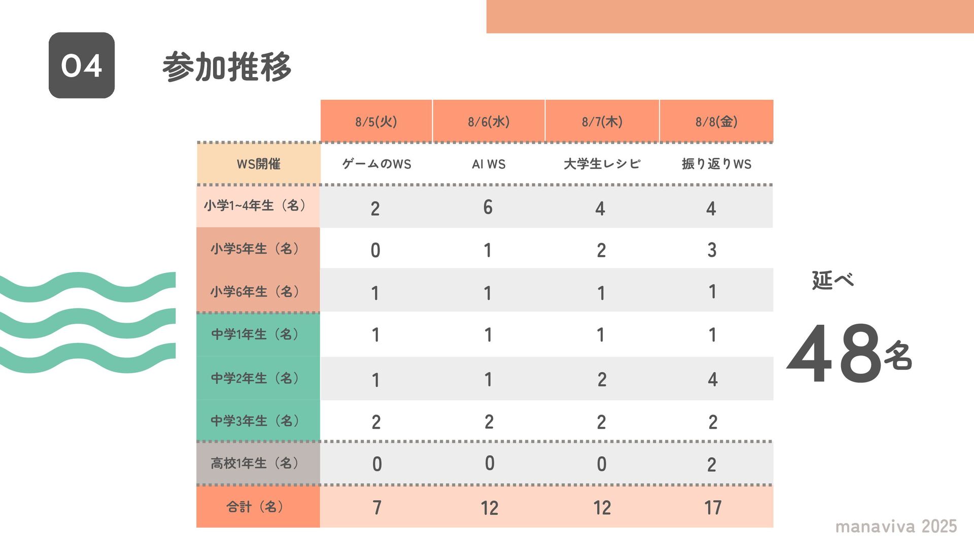 参加推移 04 48名 延べ manaviva 2025 8/5(火) WS開催 8/6(水) 8/7(木)