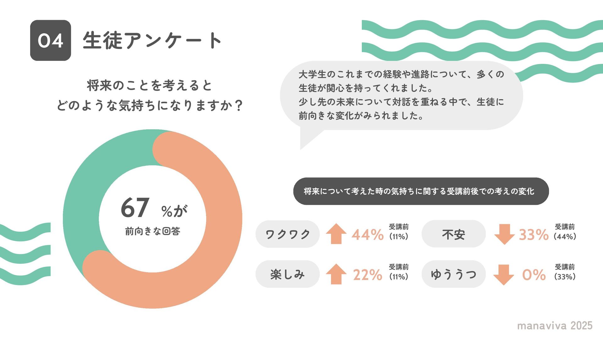 44% 33% 0% 22% 将来について考えた時の気持ちに関する受講前後での考えの変化 ワクワク 受講前 受講前 受講前 受講前 不安 楽しみ ゆううつ 将来のことを考えると どのような気持ちになりますか? 大学生のこれまでの経験や進路について、多くの 生徒が関心を持ってくれました。 少し先の未来について対話を重ねる中で、生徒に 前向きな変化がみられました。 manaviva 2025 67 %が 前向きな回答