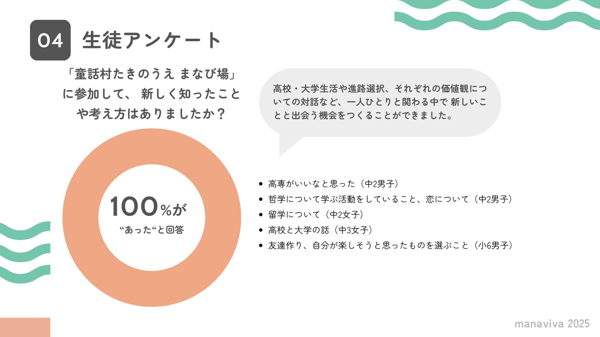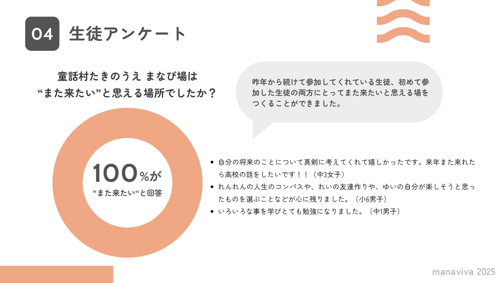 100%が “また来たい“と回答 manaviva 2025 昨年から続けて参加してくれている生徒、初めて参 加した生徒の両方にとってまた来たいと思える場を つくることができました。