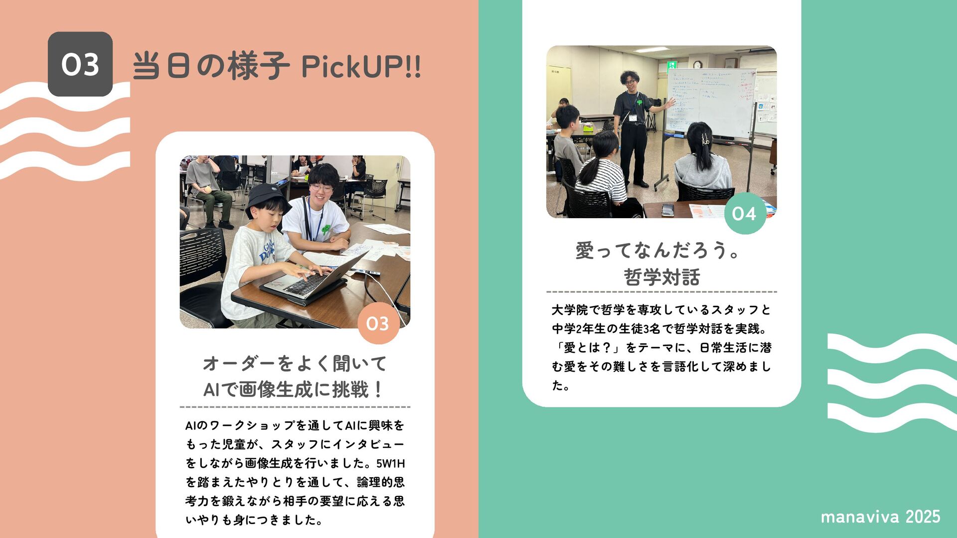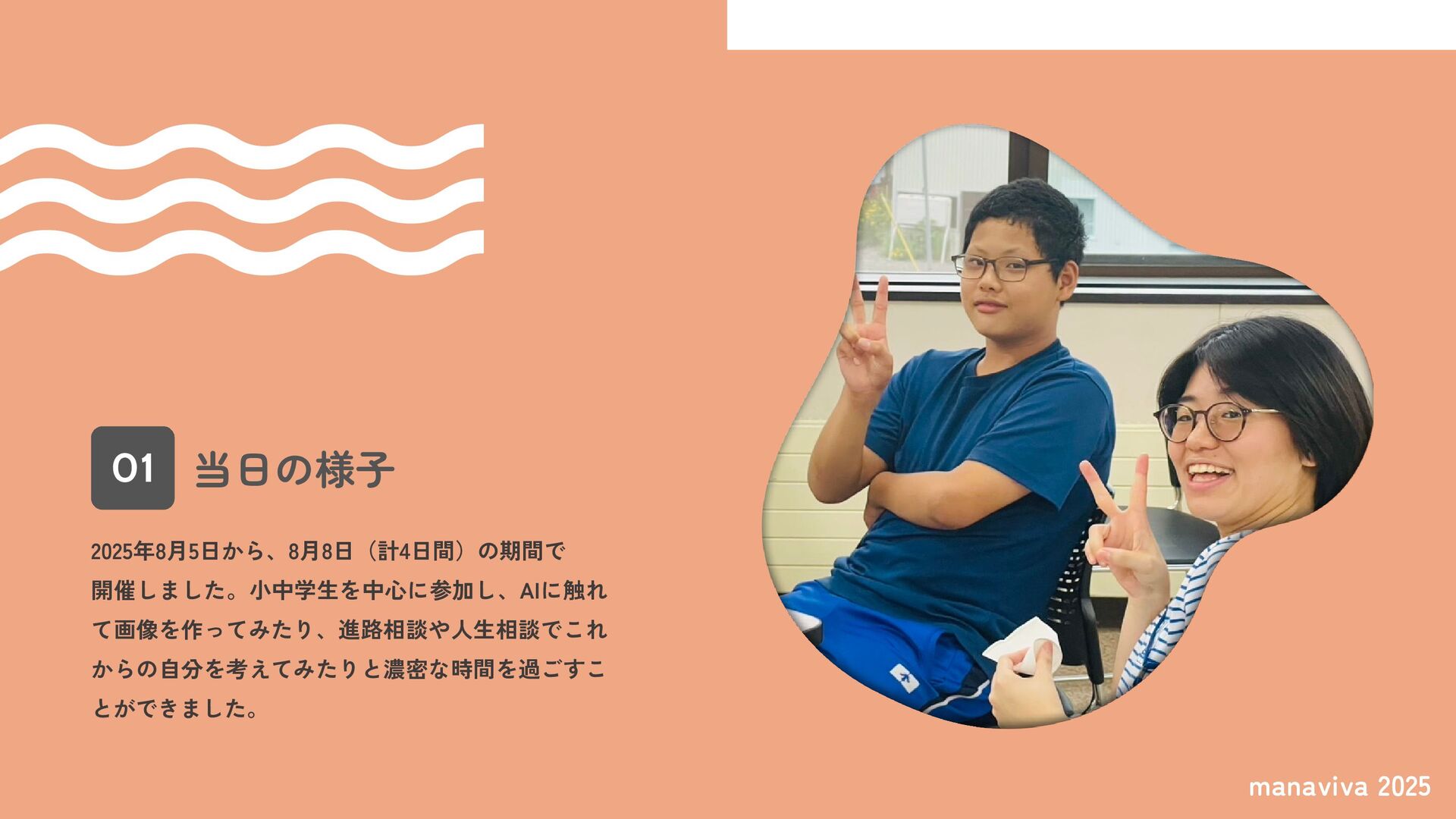 当日の様子 01 manaviva 2025 2025年8月5日から、8月8日(計4日間)の期間で 開催しました。小中学生を中心に参加し、AIに触れ て画像を作ってみたり、進路相談や人生相談でこれ からの自分を考えてみたりと濃密な時間を過ごすこ とができました。