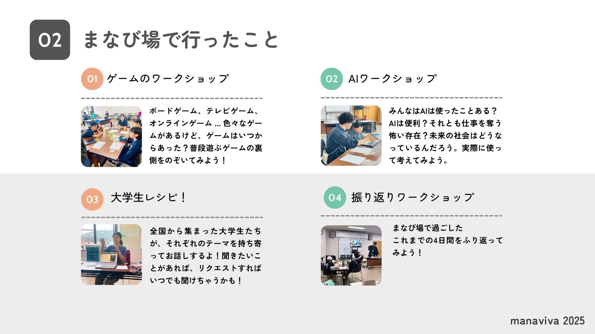 が、それぞれのテーマを持ち寄 ってお話しするよ!聞きたいこ とがあれば、リクエストすれば いつでも聞けちゃうかも! まなび場で過ごした これまでの4日間をふり返って みよう! ボードゲーム、テレビゲーム、 オンラインゲーム ... 色々なゲー ムがあるけど、ゲームはいつか らあった?普段遊ぶゲームの裏 側をのぞいてみよう! AIワークショップ 振り返りワークショップ ゲームのワークショップ 大学生レシピ! まなび場で行ったこと 02 manaviva 2025