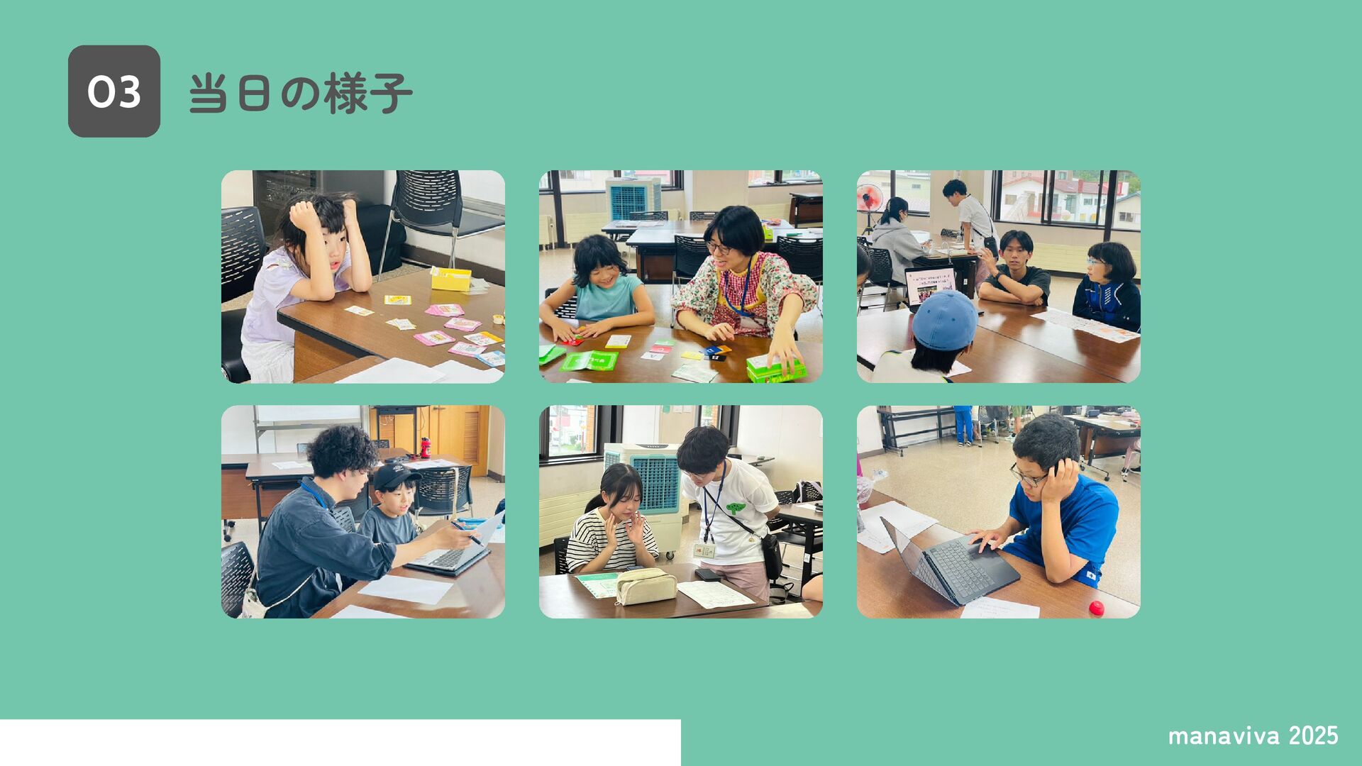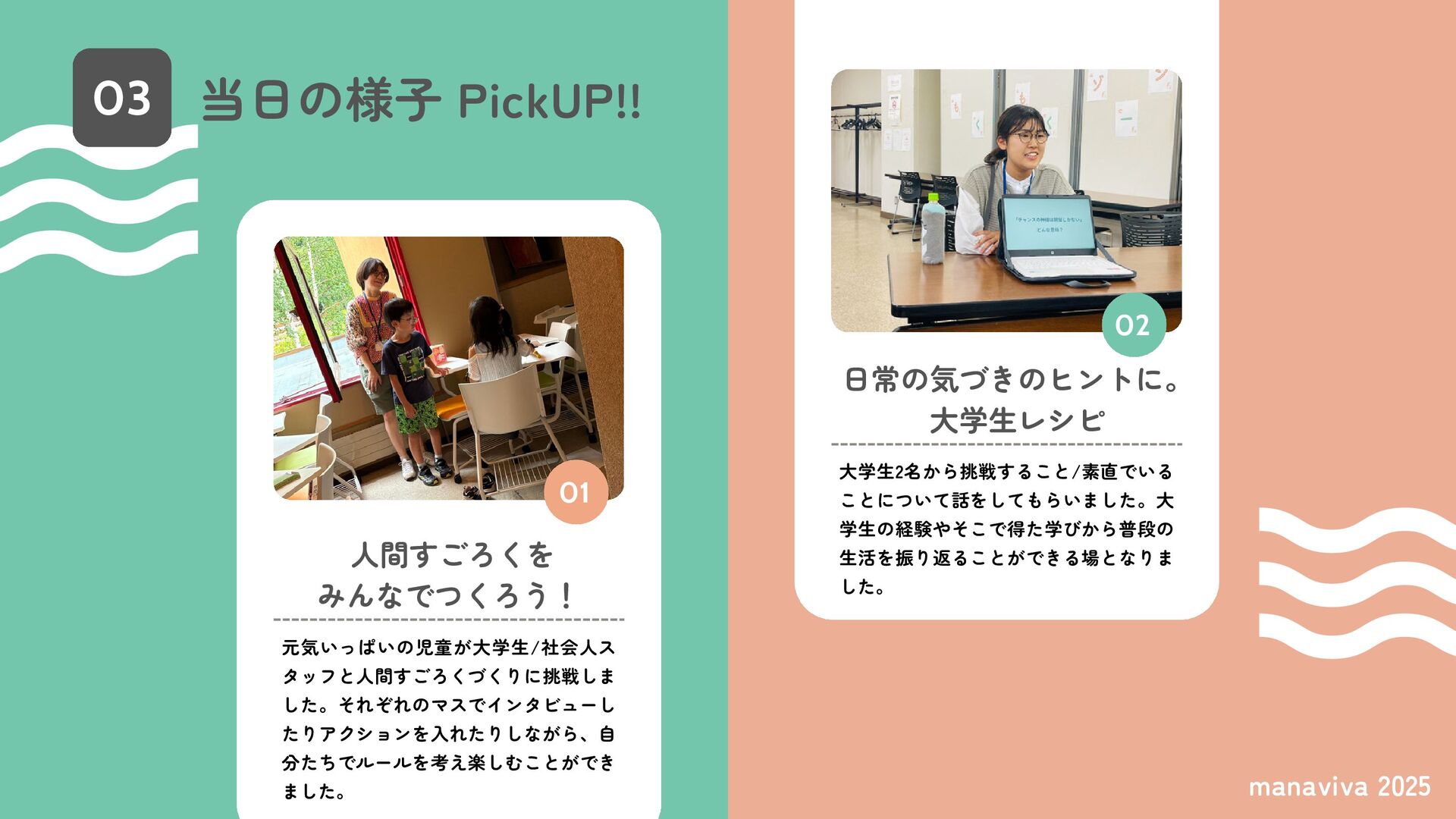 01 02 当日の様子 PickUP!! 03 manaviva 2025 元気いっぱいの児童が大学生/社会人ス タッフと人間すごろくづくりに挑戦しま した。それぞれのマスでインタビューし
