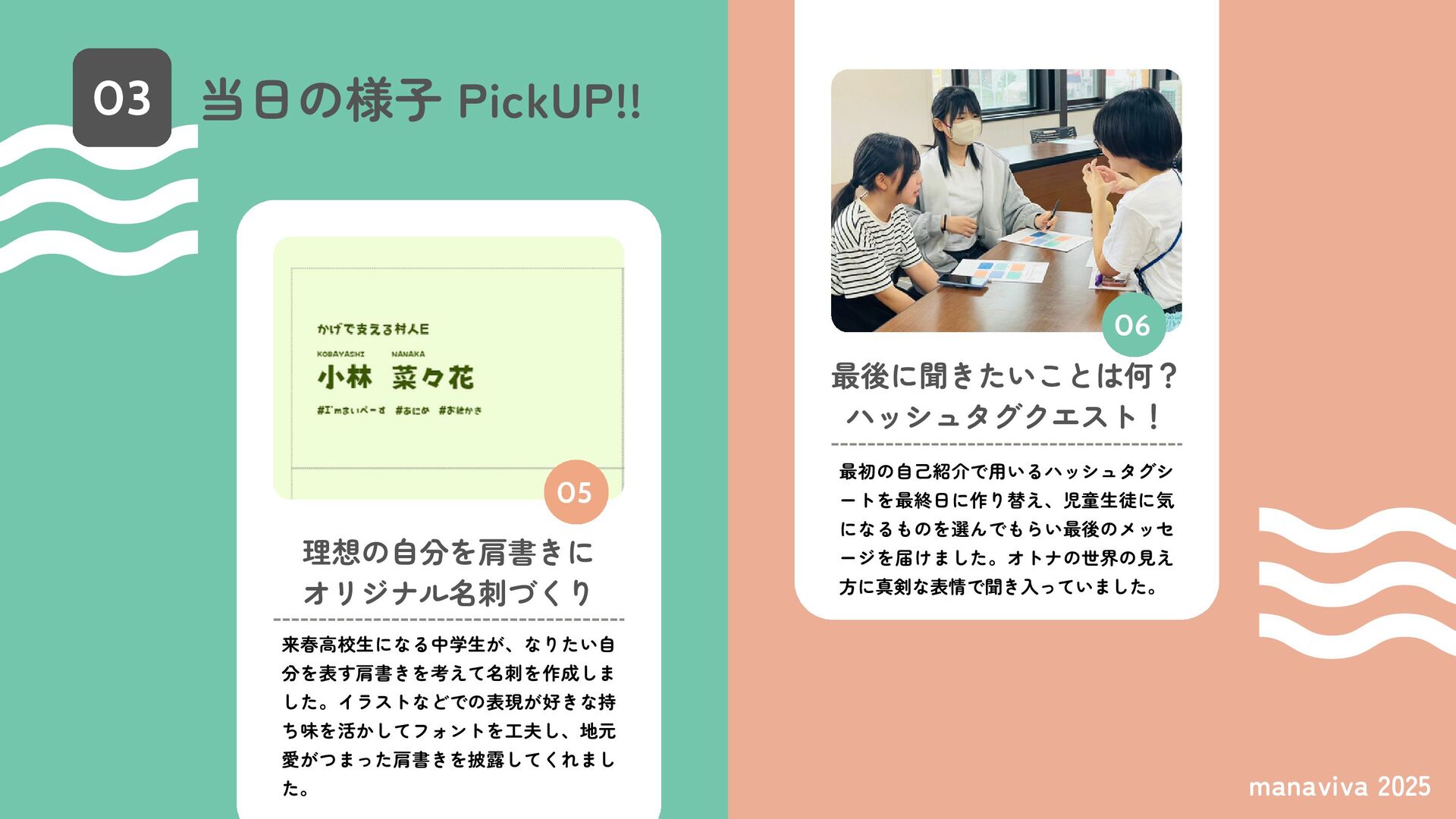 05 06 当日の様子 PickUP!! 03 manaviva 2025 最初の自己紹介で用いるハッシュタグシ ートを最終日に作り替え、児童生徒に気 になるものを選んでもらい最後のメッセ