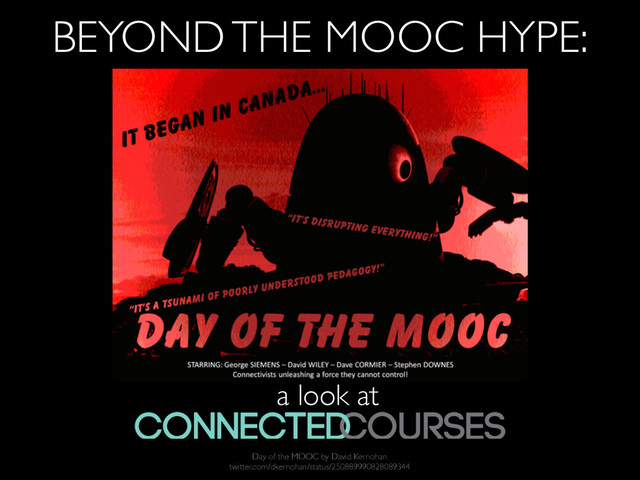 Massive Online Open Courses, MOOCs- the disruptors of higher education, the tsunami wave of a new Silicon Valley funded era, are they cresting or panning out? Going back to the pre-hype era concepts of the original works are open, connected course that are designed based on the ultimate model of growth, the internet itself. Learn about the architecture of course like DS106, Phonar, and many more open, connected courses.