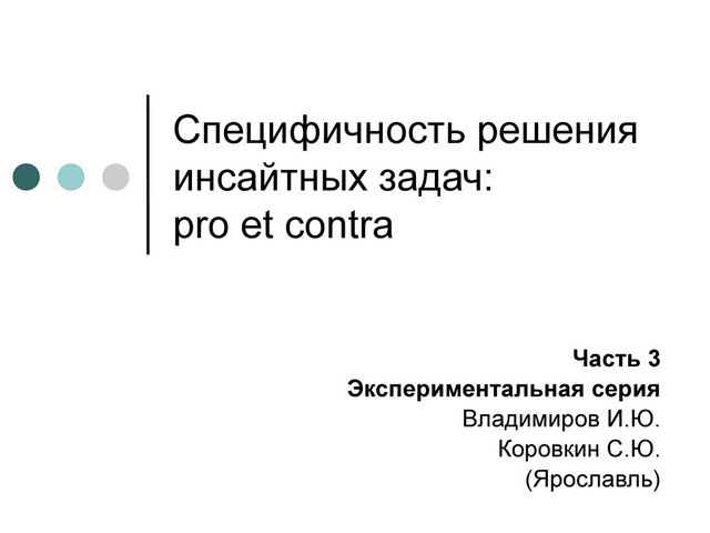 Выступление С. Ю. Коровкина с докладом "Обсуждение результатов экспериментальной проверки гипотез о специфичности инсайтного решения и характере этой специфичности" на семинаре "Автоматизм инсайта, или Почему удивляются роботы". Тезисы доклада и видео выступления опубликованы на сайте Cogito ergo ... : http://cogitoergo.ru/2012/11/insight-specificity/