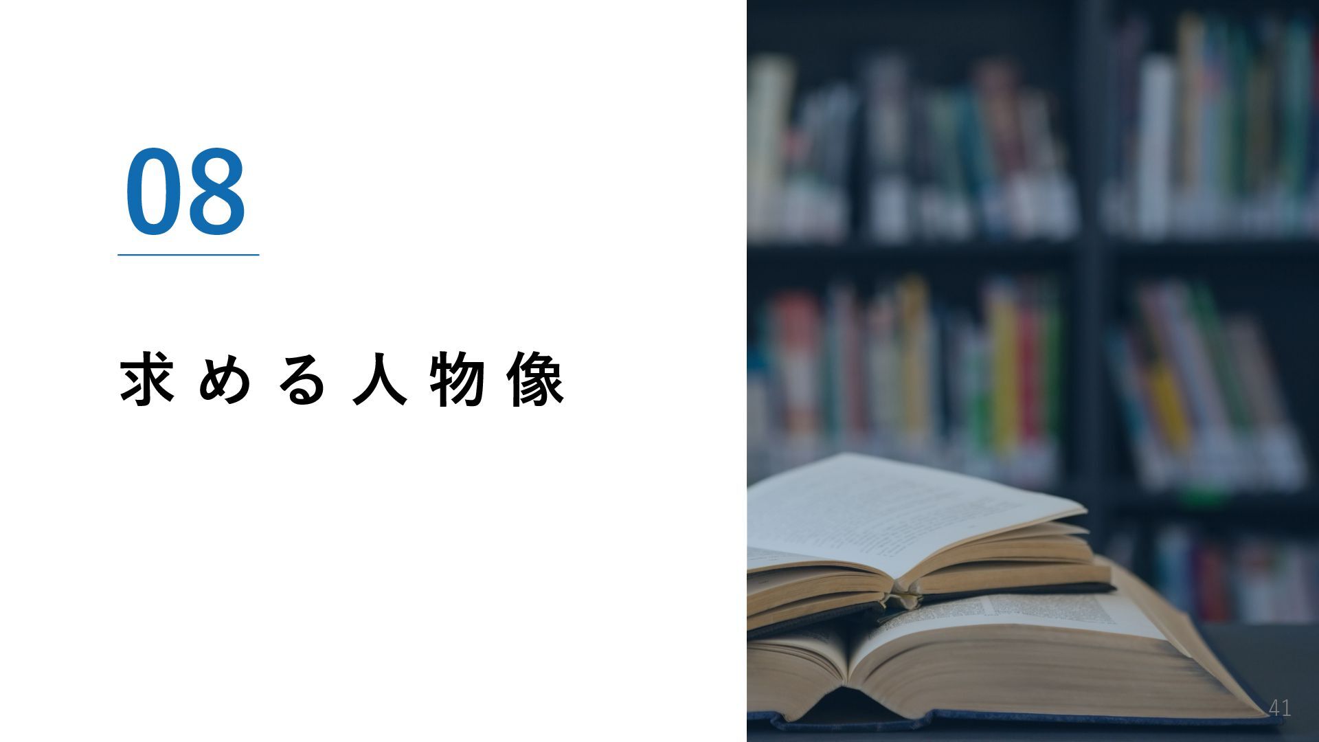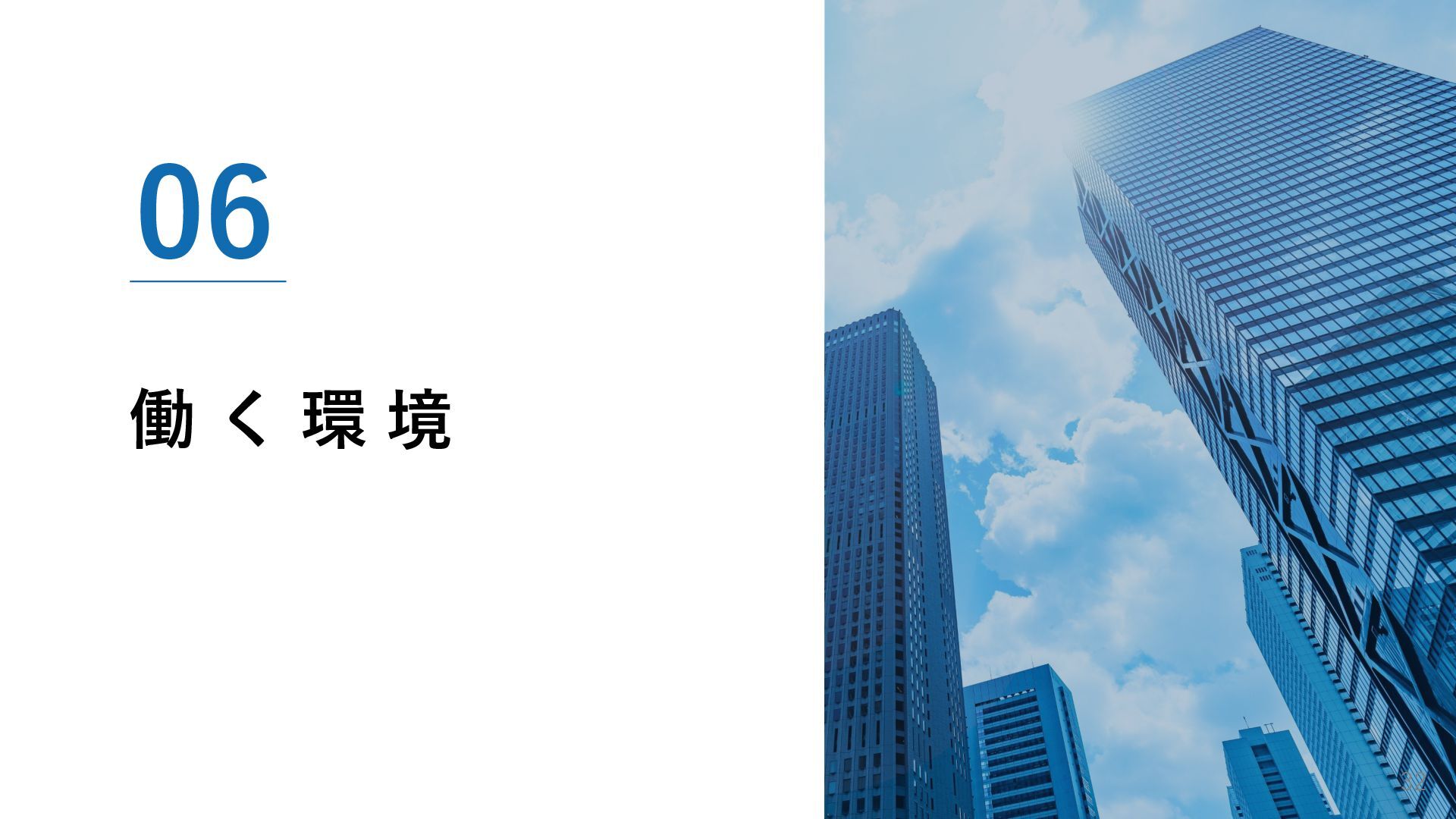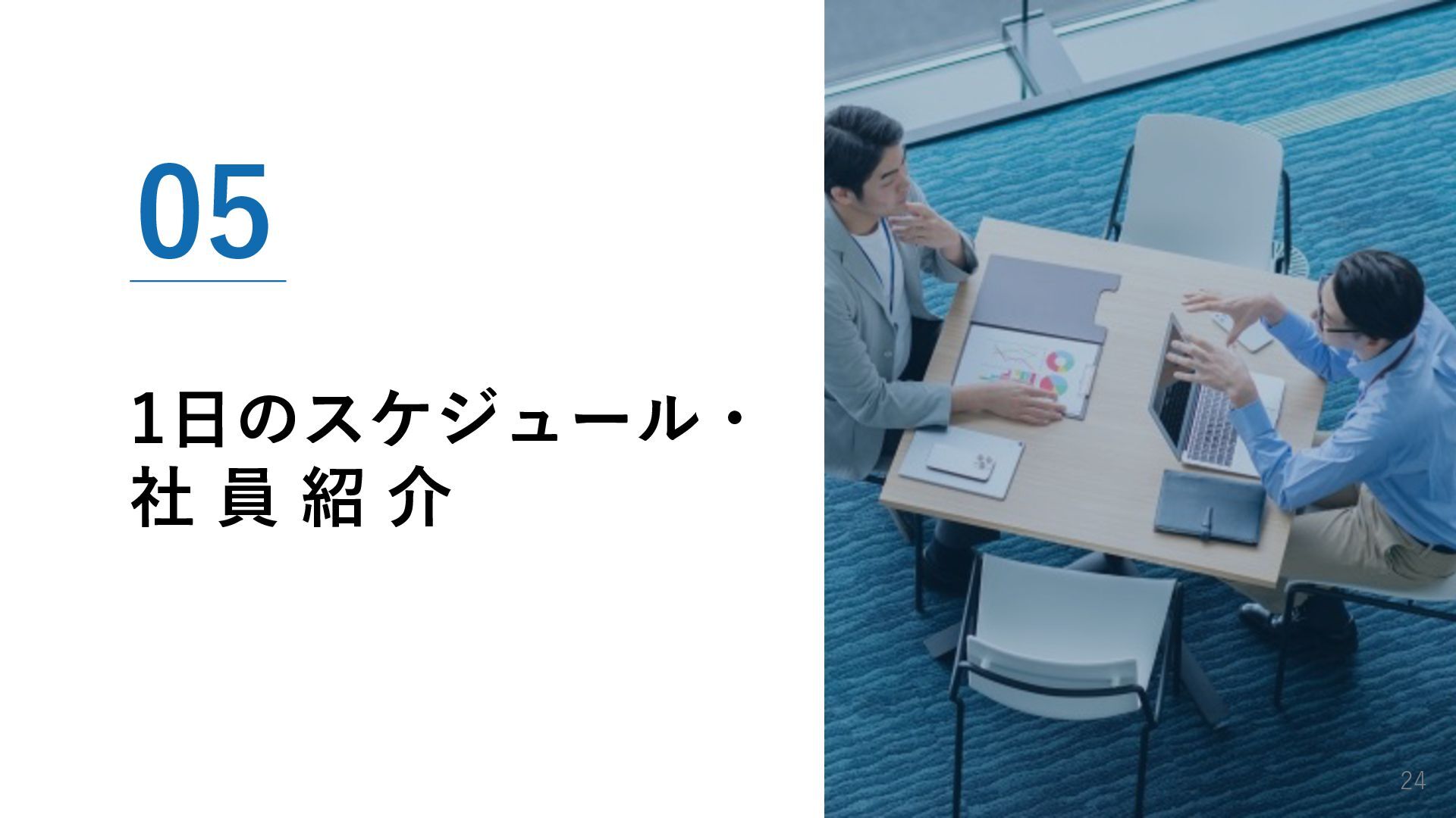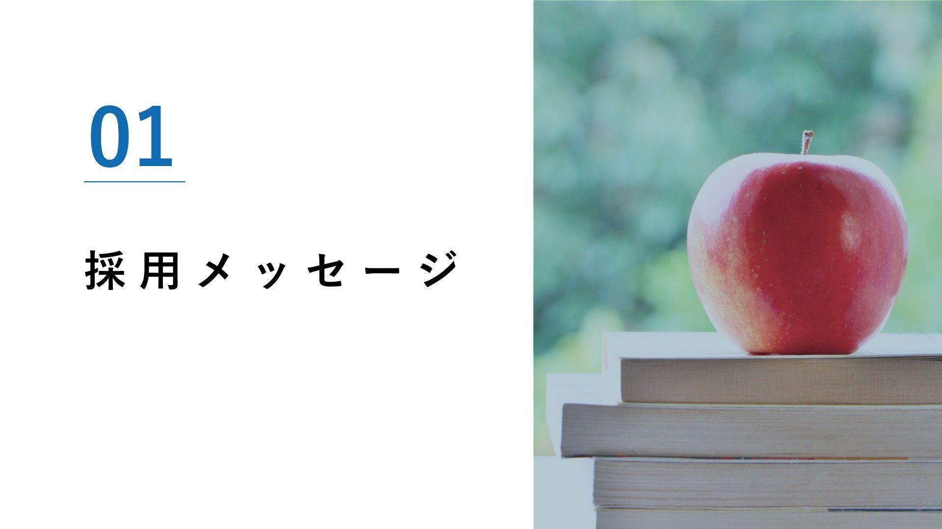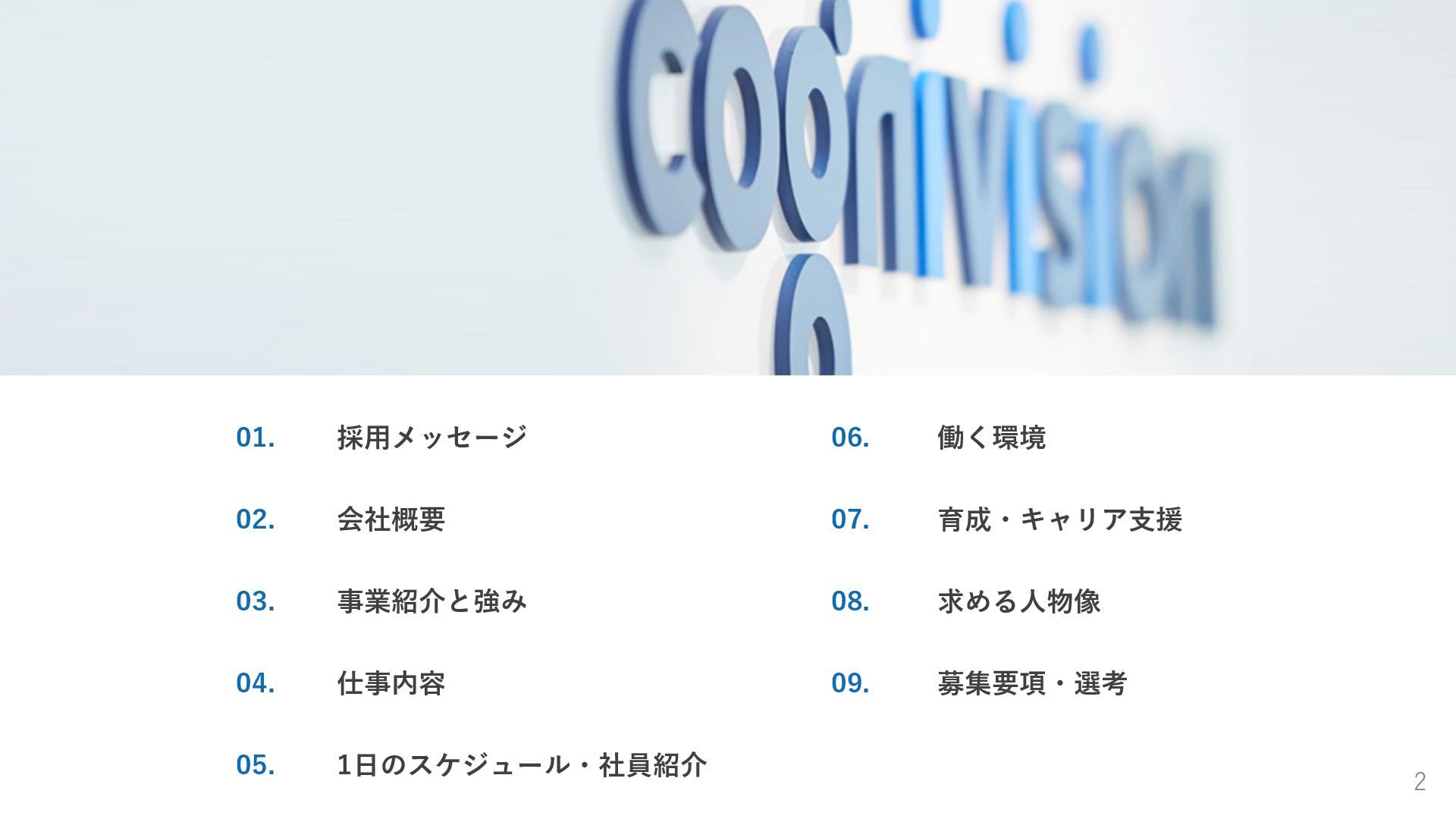 01. 採用メッセージ 02. 会社概要 03. 事業紹介と強み 04. 仕事内容 05. 1日のスケジュール・社員紹介 06. 働く環境 07. 育成・キャリア支援 08. 求める人物像 09. 募集要項・選考