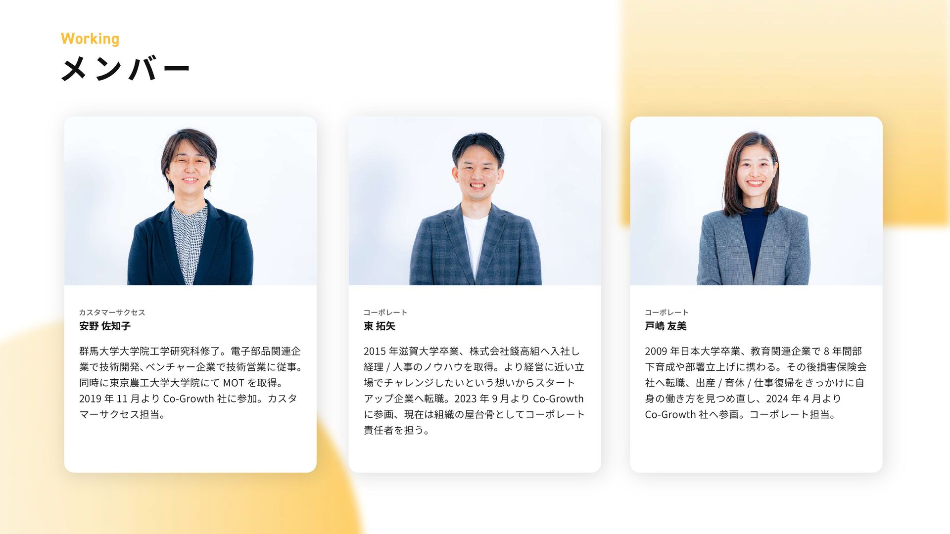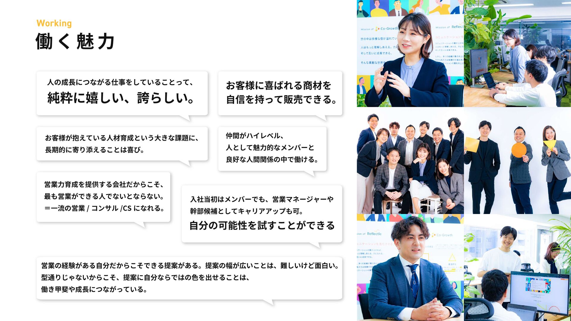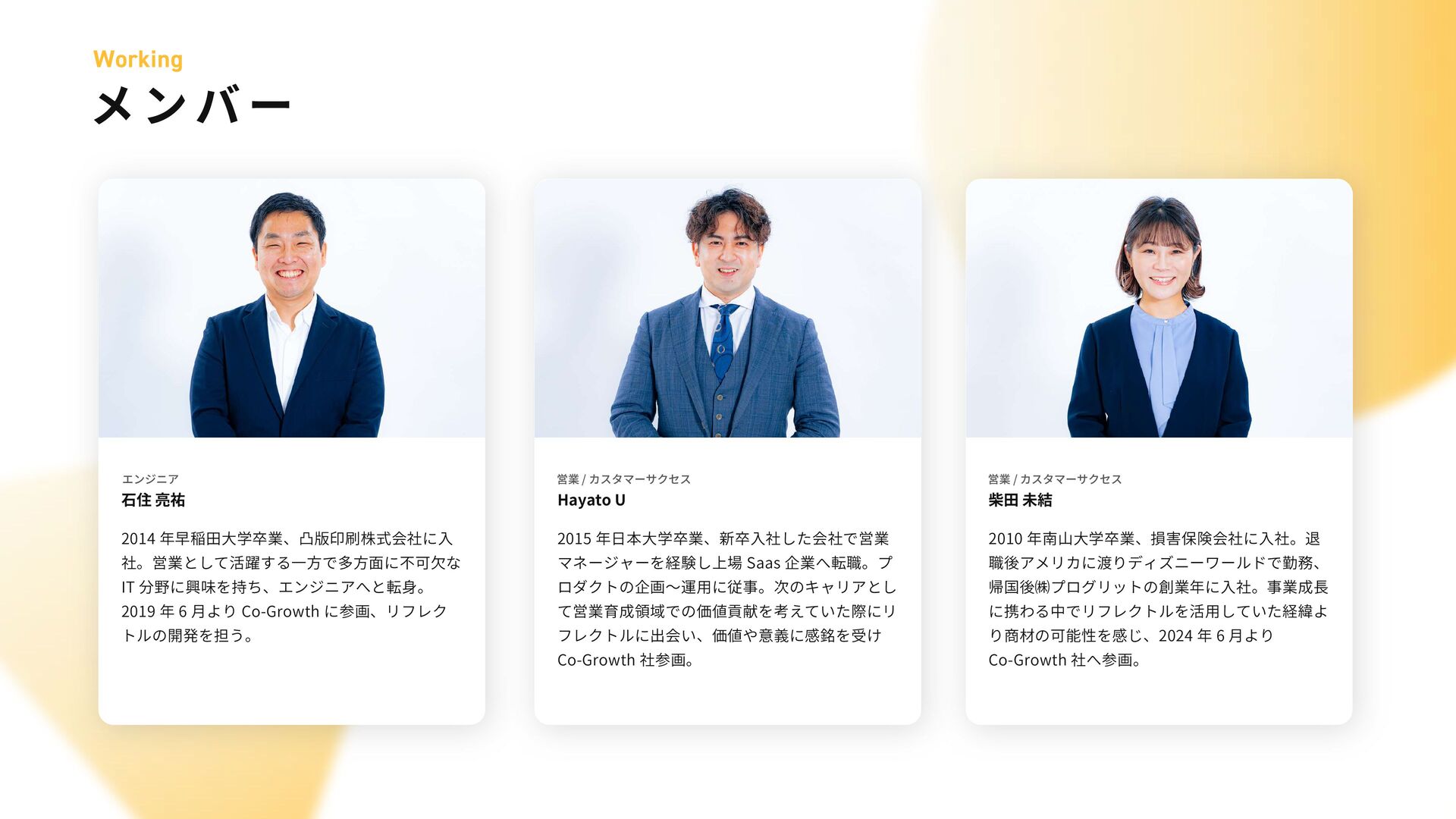 社。営業として活躍する一方で多方面に不可欠な IT 分野に興味を持ち、エンジニアへと転身。 2019 年 6 月より Co-Growth に参画、リフレク トルの開発を担う。 Hayato U 営業 / カスタマーサクセス 2015 年日本大学卒業、新卒入社した会社で営業 マネージャーを経験し上場 Saas 企業へ転職。プ ロダクトの企画~運用に従事。次のキャリアとし て営業育成領域での価値貢献を考えていた際にリ フレクトルに出会い、価値や意義に感銘を受け Co-Growth 社参画。 柴田 未結 営業 / カスタマーサクセス 2010 年南山大学卒業、損害保険会社に入社。退 職後アメリカに渡りディズニーワールドで勤務、 帰国後㈱プログリットの創業年に入社。事業成長 に携わる中でリフレクトルを活用していた経緯よ り商材の可能性を感じ、2024 年 6 月より Co-Growth 社へ参画。