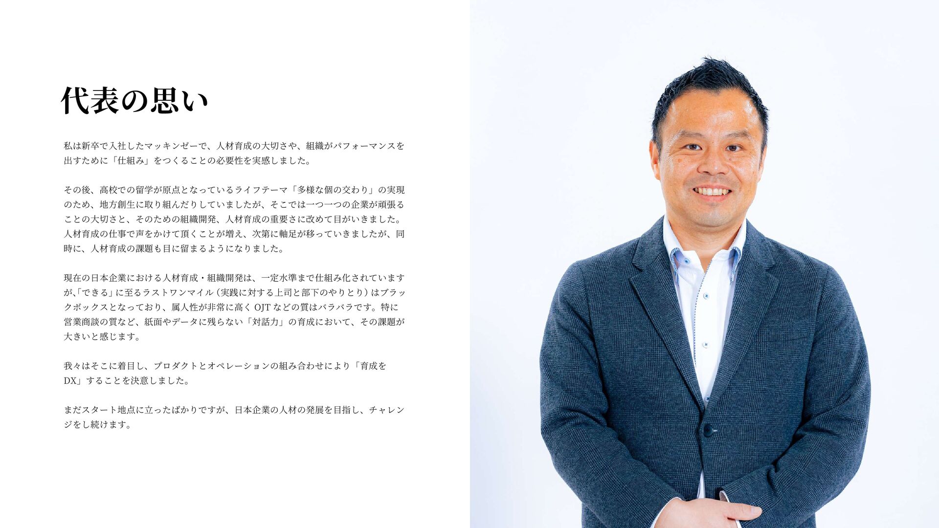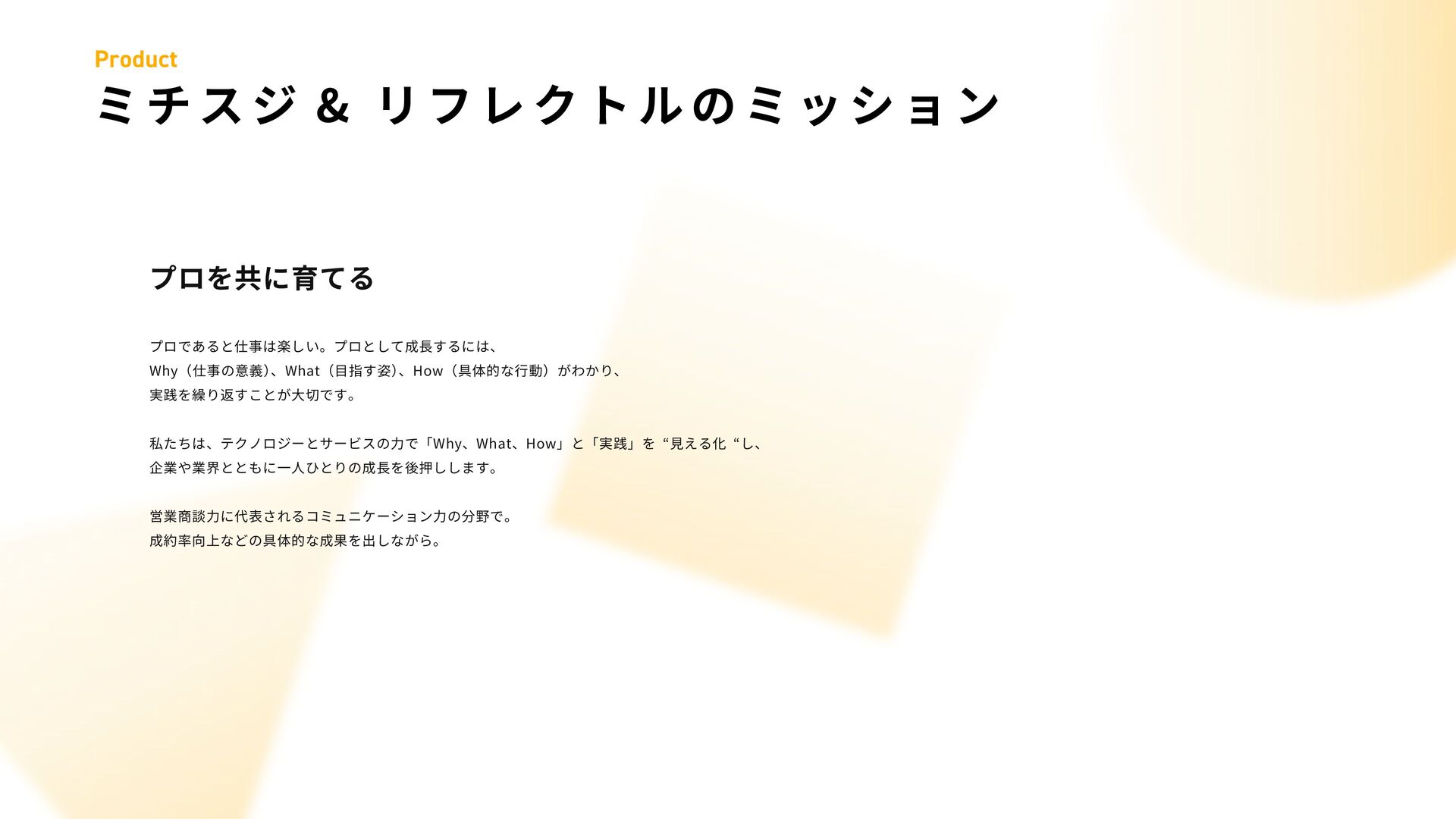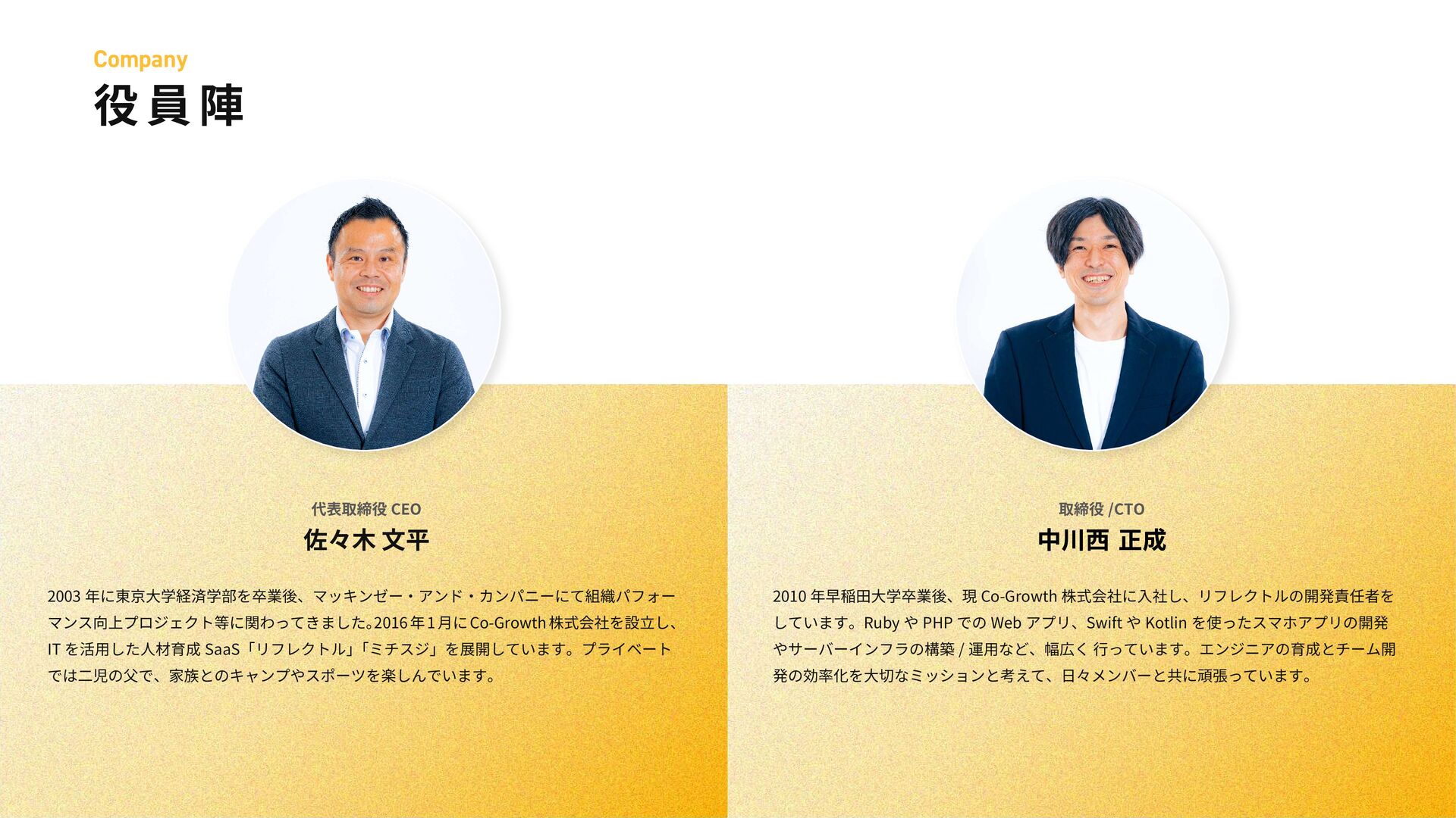 社。営業として活躍する一方で多方面に不可欠な IT 分野に興味を持ち、エンジニアへと転身。 2019 年 6 月より Co-Growth に参画、リフレク トルの開発を担う。 Hayato U 営業 / カスタマーサクセス 2015 年日本大学卒業、新卒入社した会社で営業 マネージャーを経験し上場 Saas 企業へ転職。プ ロダクトの企画~運用に従事。次のキャリアとし て営業育成領域での価値貢献を考えていた際にリ フレクトルに出会い、価値や意義に感銘を受け Co-Growth 社参画。 柴田 未結 営業 / カスタマーサクセス 2010 年南山大学卒業、損害保険会社に入社。退 職後アメリカに渡りディズニーワールドで勤務、 帰国後㈱プログリットの創業年に入社。事業成長 に携わる中でリフレクトルを活用していた経緯よ り商材の可能性を感じ、2024 年 6 月より Co-Growth 社へ参画。
