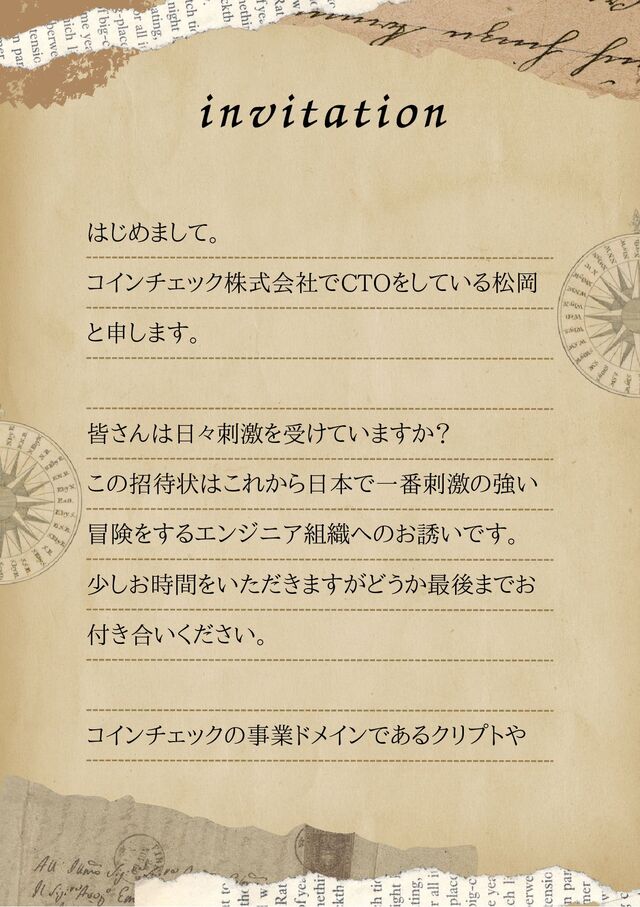はじめまして。 コインチェック株式会社でCTOをしている松岡 と申します。 皆さんは日々刺激を受けていますか? この招待状はこれから日本で一番刺激の強い 少しお時間をいただきますがどうか最後までお 冒険をするエンジニア組織へのお誘いです。 付き合いください。 コインチェックの事業ドメインであるクリプトや invitation