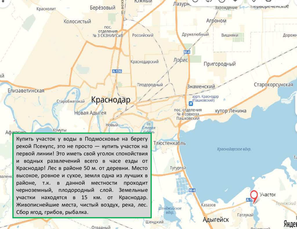 Купить участок у воды в краснодарская область на берегу рекой Псекупс, это не просто — купить участок на первой линии! Это иметь свой уголок спокойствия и водных развлечений всего в часе езды от Краснодар! Лес в районе 50 м. от деревни. Место высокое, ровное и сухое, земля одна из лучших в районе, т.к. в данной местности проходит черноземный, плодородный слой. Земельные участки находятся в 15 км. от Краснодар. Живописнейшие места, чистый воздух, река, лес. Сбор ягод, грибов, рыбалка.