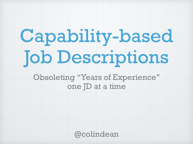 I gave this lightning talk at Code & Supply's Engineering Management first working group meeting on Building Job Descriptions (https://www.meetup.com/Pittsburgh-Code-Supply/events/250358603/). It was a series of talks followed by a roundtable discussion.
