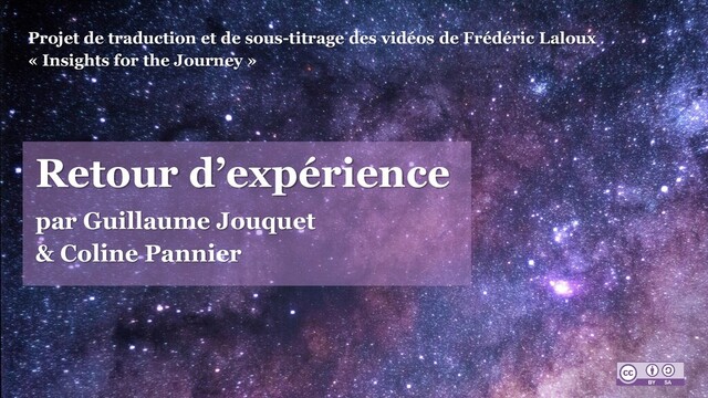Nous avons participé, avec une trentaine d’autres bénévoles qui ne se connaissaient pas, à un projet de traduction et de sous-titrage en français des 133 vidéos « Insights for the Journey » créées par Frédéric Laloux dans le prolongement de son livre Reinventing Organizations. Ce projet a duré environ 1 an, entre octobre 2018 et novembre 2019.