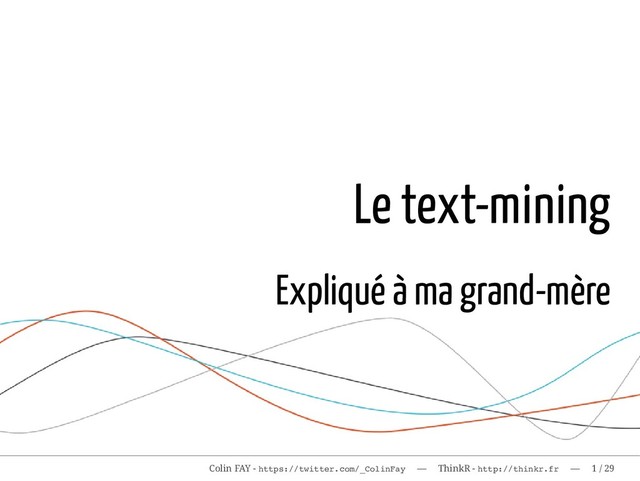 avons mis tous les mots de toutes les chansons de Sardou, que nous les avons tous compté un par un, en notant la fréquence de chaque. Résultat ? Le terme qui ressort le plus est "amour". "Attends, ça devrait plutôt être "le", non ? Bonne remarque, en text-mining, nous avons une méthode qui consiste à retirer les mots vides de sens du corpus, que l'on appelle également "stopwords". Par exemple, en français, on retrouve : #> [1] a abord absolument #> [4] afin ah ai #> [7] aie aient aies #> [10] ailleurs ainsi ait #> [13] allaient allo allons #> [16] allô alors anterieur #> [19] anterieure anterieures apres #> [22] après as assez #> [25] attendu au aucun #> [28] aucune aucuns aujourd #> [31] aujourd'hui aupres auquel #> [34] aura aurai auraient Colin FAY - https://twitter.com/_ColinFay — ThinkR - http://thinkr.fr — 10 / 29