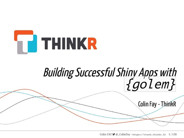 RStudio related platforms golem::add_rstudioconnect_file() golem::add_shinyappsio_file() golem::add_shinyserver_file() ## Docker ---- ## If you want to deploy via a generic Dockerfile golem::add_dockerfile() ## If you want to deploy to ShinyProxy golem::add_dockerfile_shinyproxy() ## If you want to deploy to Heroku golem::add_dockerfile_heroku() Send to prod Once everything is tested, you can send to prod using {golem} Deploy on a server, or build as a tar.gz with pkgbuild::build() Colin FAY @_ColinFay - https://rtask.thinkr.fr 126 / 130