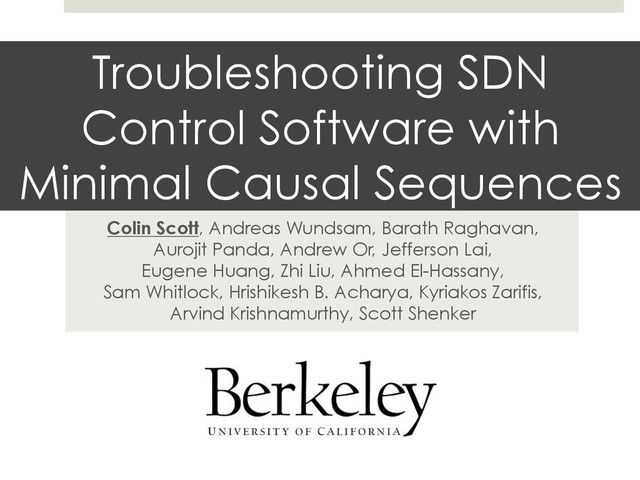 Jefferson Lai, Eugene Huang, Zhi Liu, Ahmed El-Hassany, Sam Whitlock, Hrishikesh B. Acharya, Kyriakos Zarifis, Arvind Krishnamurthy, Scott Shenker Troubleshooting SDN Control Software with Minimal Causal Sequences