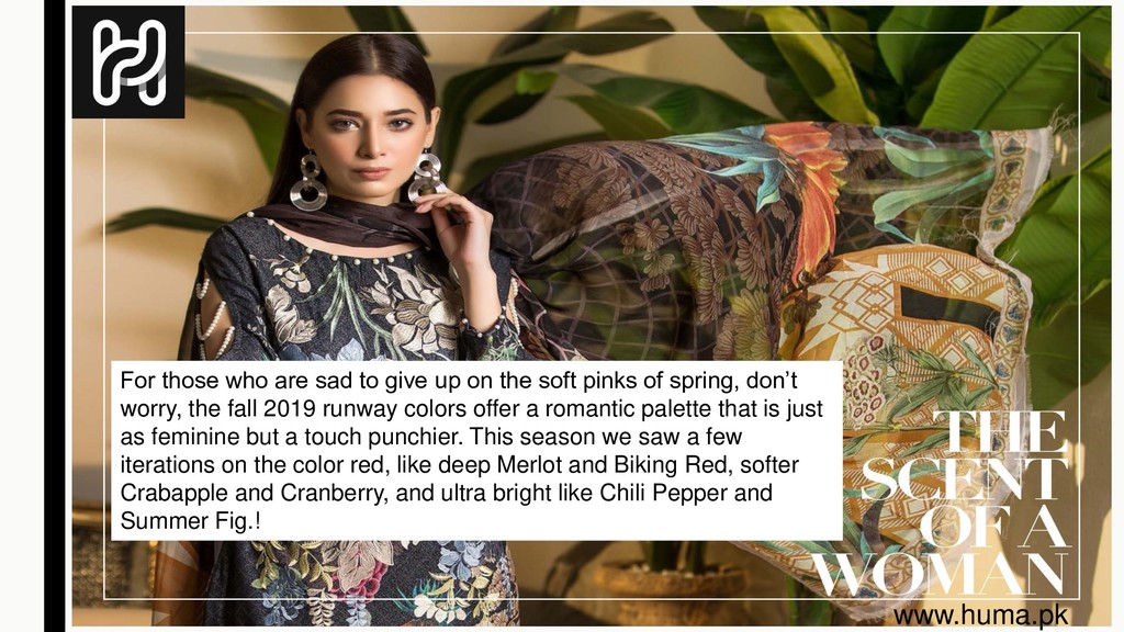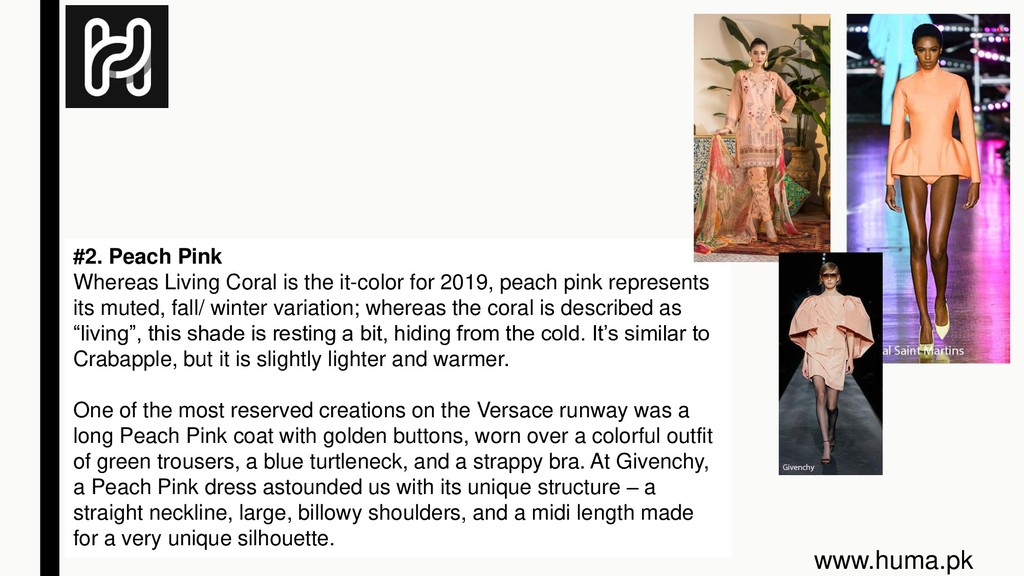 2019, peach pink represents its muted, fall/ winter variation; whereas the coral is described as “living”, this shade is resting a bit, hiding from the cold. It’s similar to Crabapple, but it is slightly lighter and warmer. One of the most reserved creations on the Versace runway was a long Peach Pink coat with golden buttons, worn over a colorful outfit of green trousers, a blue turtleneck, and a strappy bra. At Givenchy, a Peach Pink dress astounded us with its unique structure – a straight neckline, large, billowy shoulders, and a midi length made for a very unique silhouette. www.huma.pk